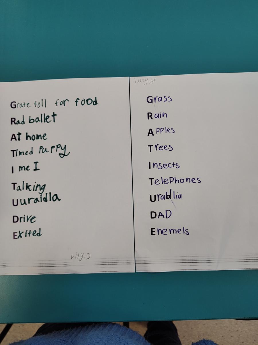 Continuing our theme of gratitude, some of our students in our Monday lunchtime activity/art group completed an activity describing what they are grateful for, using the letters of the word Gratitude.
