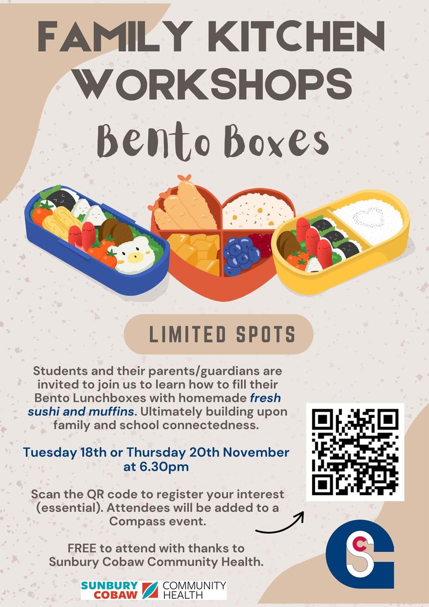We are excited to announce our Term 4 workshops - Bento Boxes where students and their parents/guardians are invited to join us to learn how to fill their Bento Lunchboxes with homemade fresh sushi and muffins.