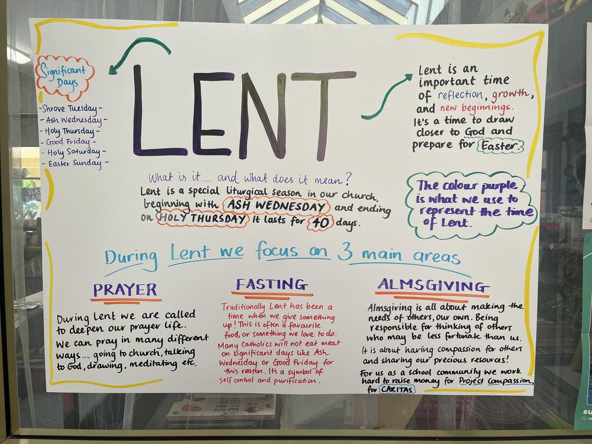 Students have begun to learn about the Season of Lent and the connections we have with Easter. On Ash Wednesday we changed the colour of the prayer tables to purple to represent this special liturgical season. If you would like to learn a little more about the Season of Lent, please pop into the foyer in the learning building to have a read of the information we have on display.