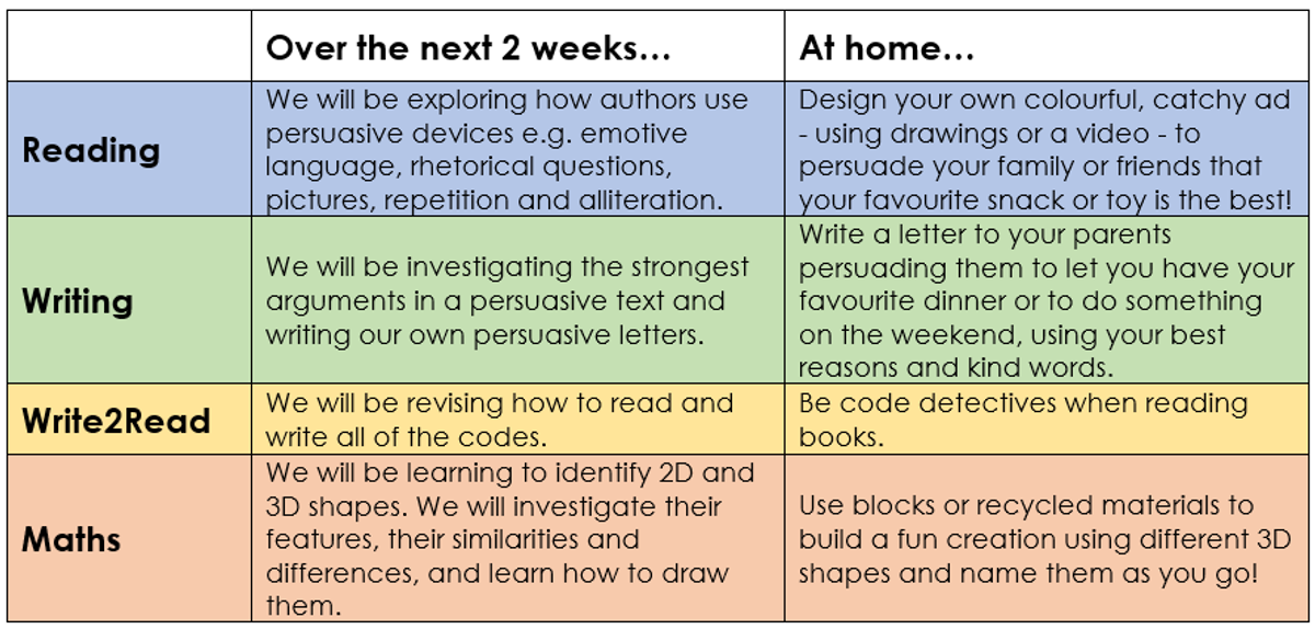 High Frequency Words & Yellow Reading Log: Continue to help your child to practise their high frequency words and read each night. They are stored in their blue display folder in their communication folder.