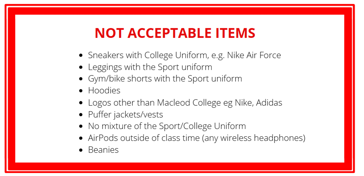 If unable to wear any part of the uniform, the student must bring a note signed by their parent/guardian and present themselves to their student manager before the home group lesson. If the reason is acceptable a uniform pass will be issued. Failure to provide an acceptable note will result in a detention being allocated to the student.