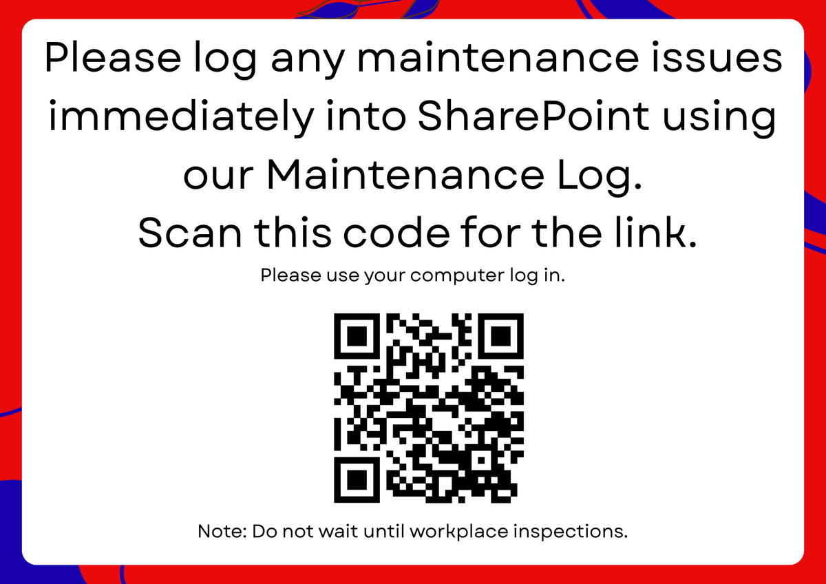 You’ll notice new posters around the school with a QR code for our Maintenance Log. Please use these to quickly report any maintenance issues as soon as you see them. Simply scan the QR code with your phone, log in using your computer details, and record the issue directly in SharePoint.