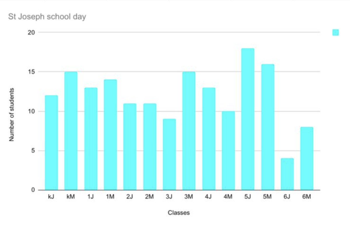Today St Joseph’s participated in Walk Safely To School Day, and I’ve made a graph to show how many people in each class had a stroll and walked to school! Good job 5J, you had the most people walk to school! And year 6, I’m sure you’ll do better next time.