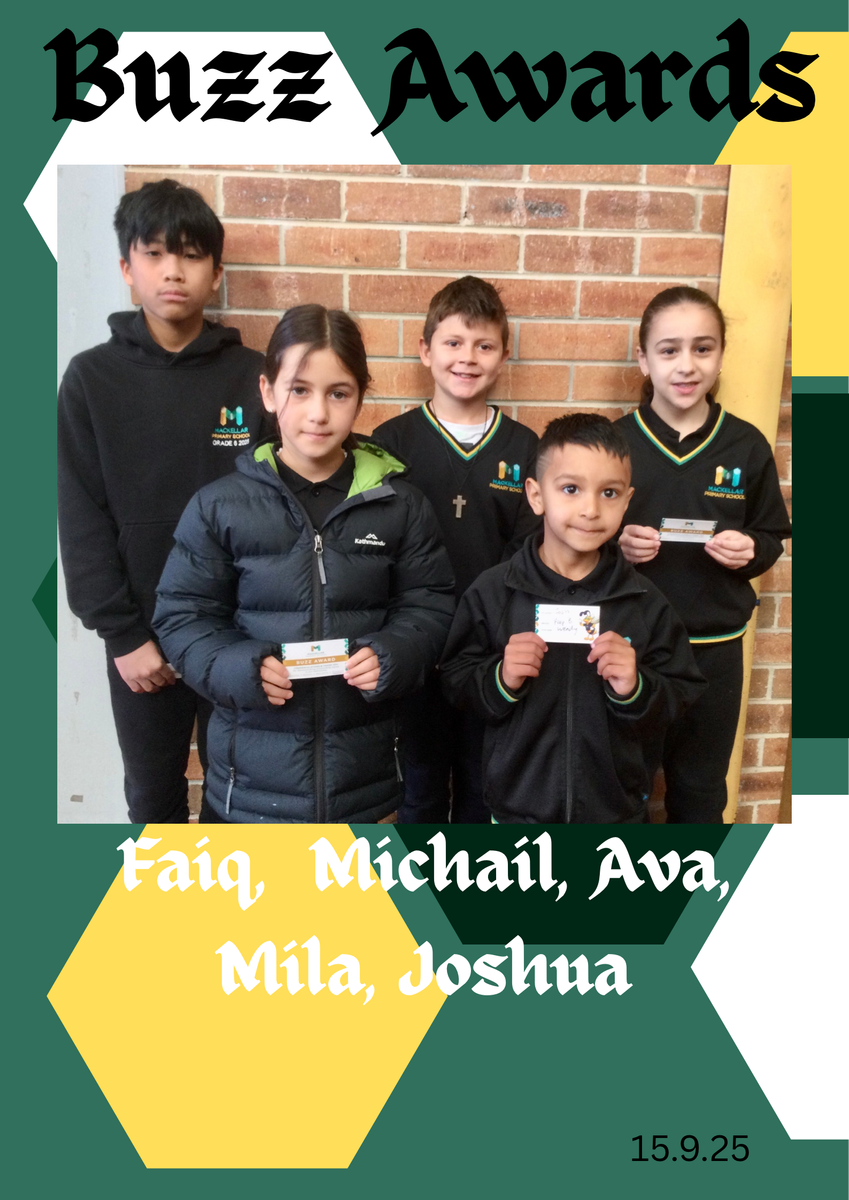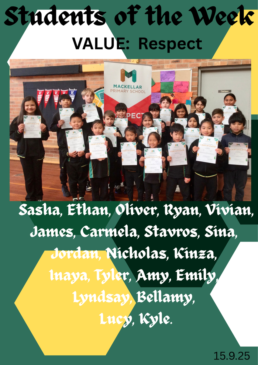 | Jordan | 2A | Jordan has demonstrated the value of respect by listening carefully, using kind words, and treating teachers and classmates with care. Well done, Jordan, for being a respectful role model in our school community! |