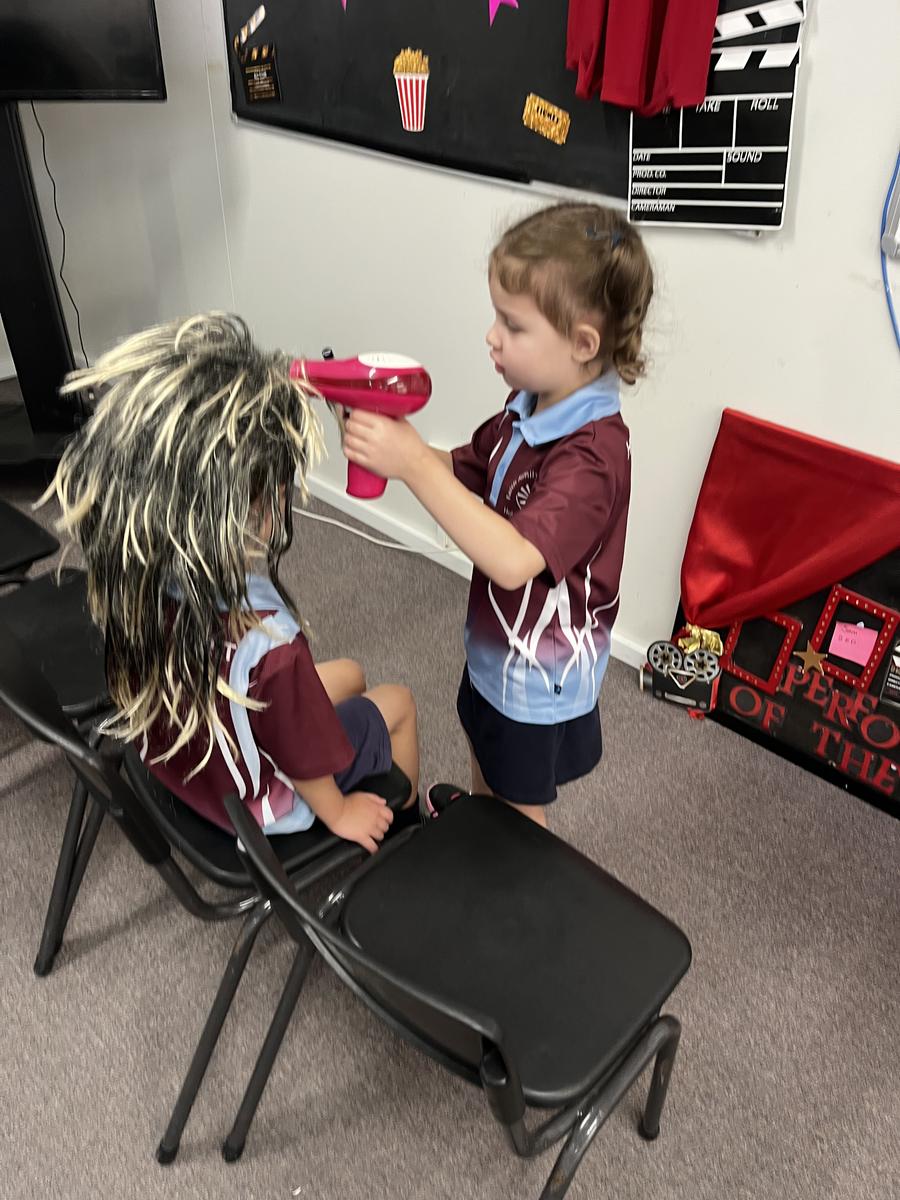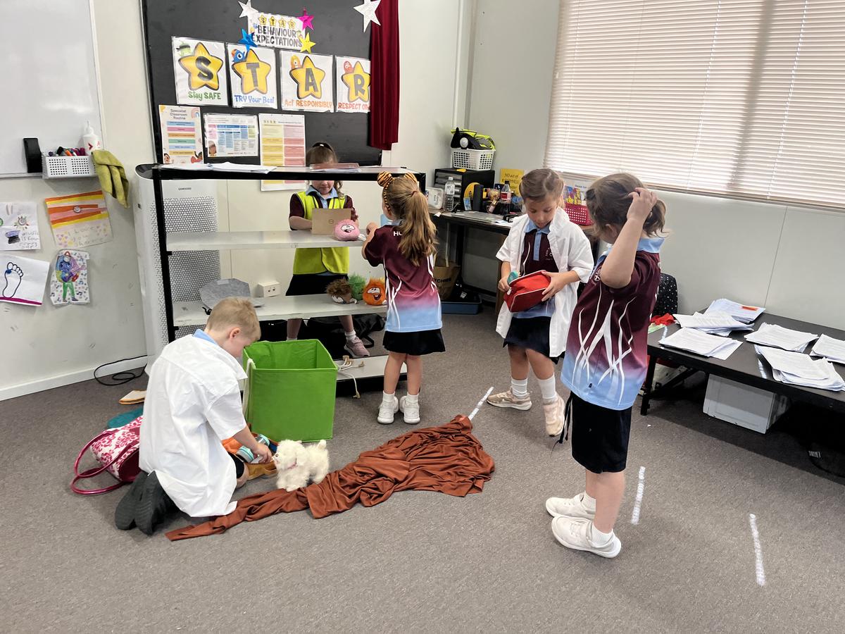 In Prep–2, students explored different real-world settings such as a café, hairdresser, vet, and building site. They stepped into character roles, using their voices, facial expressions, and actions to bring these environments to life. Building on this, they worked in groups to create their own short stories, developing a beginning, a problem, and a resolution. Through improvisation and rehearsal, they refined their performances, learning how to express themselves as a character and collaborate with their peers.