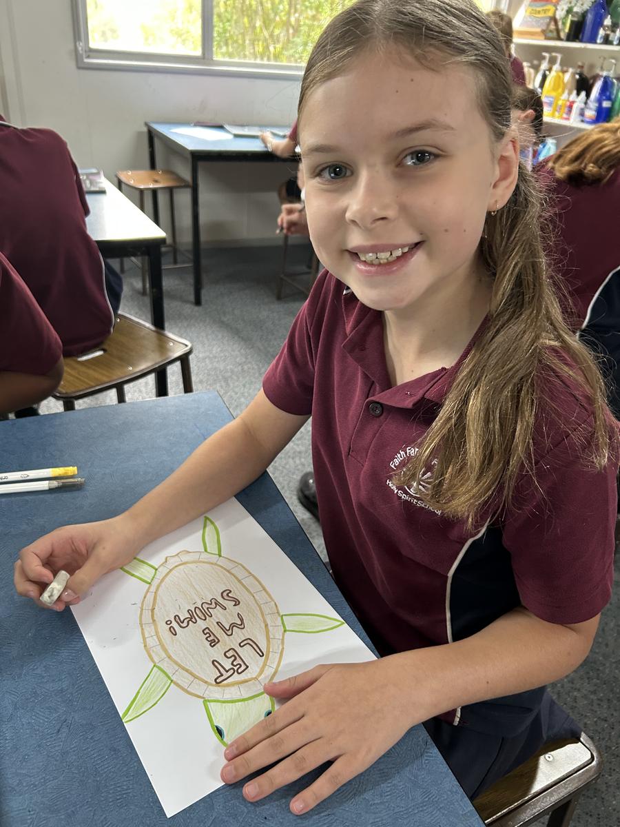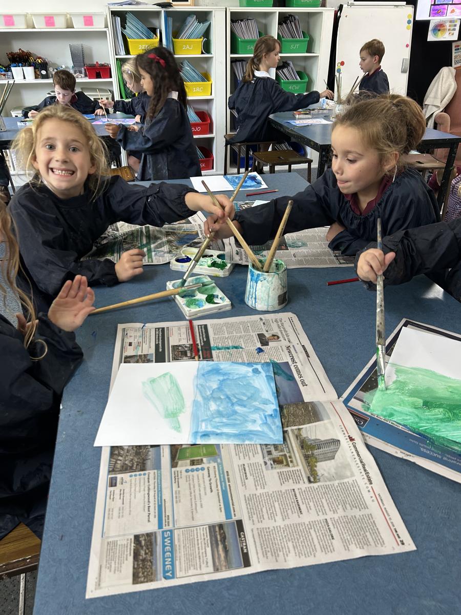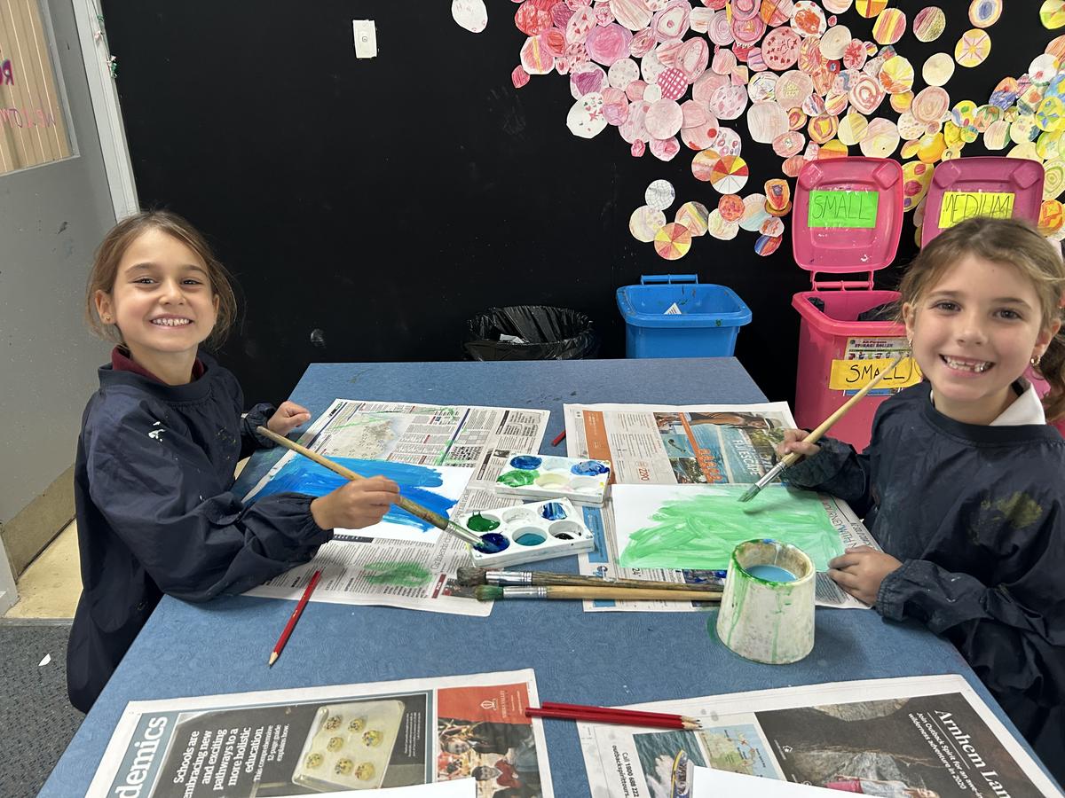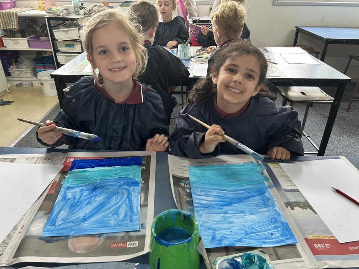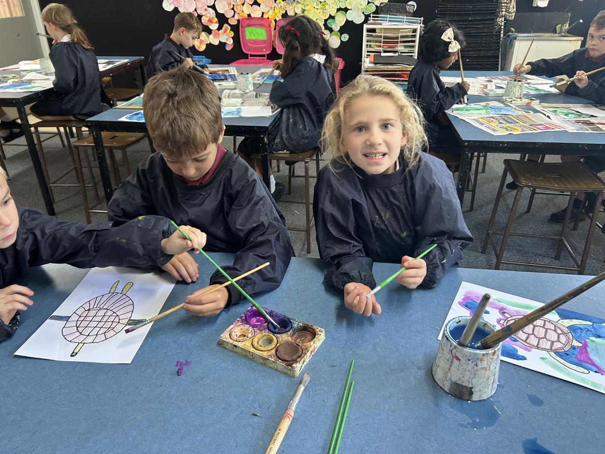 Year 1/2 students have completed their turtle artworks, painting underwater-themed backgrounds. They have now started their next project, which will continue next term—creating Earth collages using ripped paper on painted blue and green backgrounds.