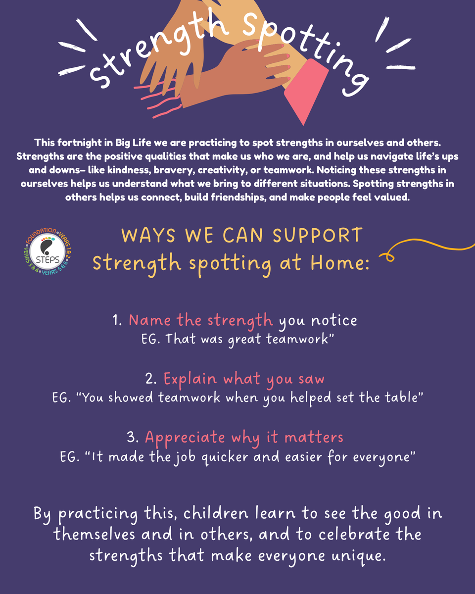 In this Footsteps lesson, students are recognising the strengths in others - ‘strength spotting’. We encourage you to notice and celebrate the strengths that students are dialling up or down students across the week- to navigate change and challenge and be resilient. Thus, building their confidence.