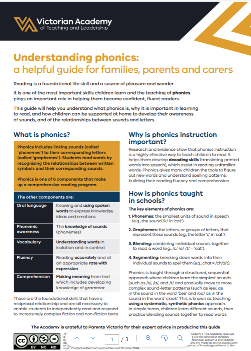 Please find attached a valuable resource produced by the Victorian Academy of Teaching and Leadership that provides valuable information regarding understanding phonics and suggested activities you can do at home with your children.