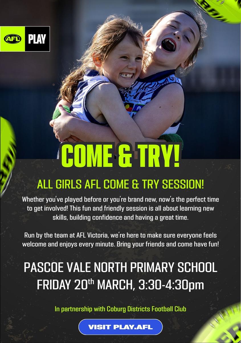 Coburg District Football club in conjunction with Auskick are going to trial an all girls football Auskick session on Friday the 20th of March between 3.30-4.30. If any of your children are interested, bring them along to the session for a try out. The aim is for weekly sessions if there is enough intetest in the clinics.