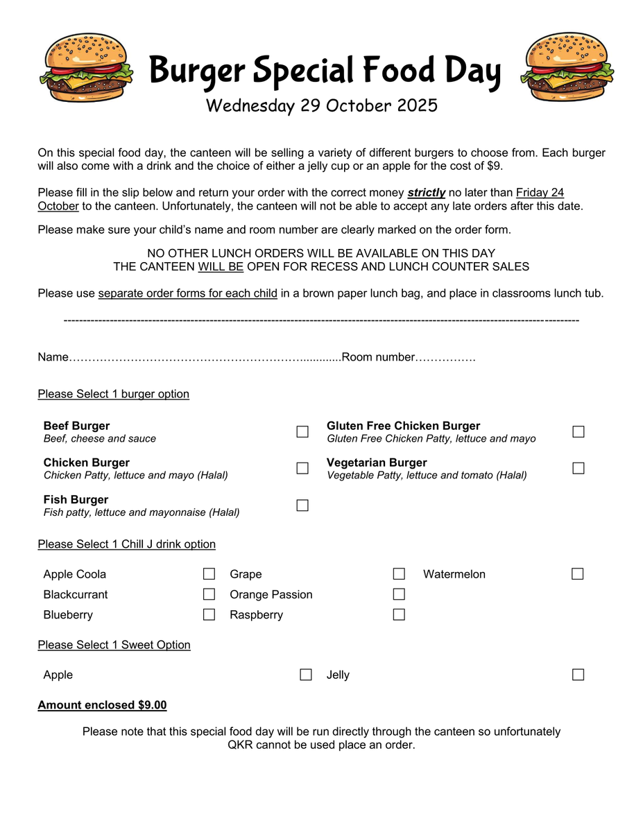 On Wednesday 29 October the Canteen will be offering students a special lunch menu. A hard copy order form should have gone home with your child. If you have not received a copy one can, be collected from the school office.