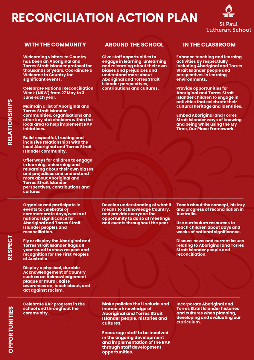 A Reconciliation Action Plan (RAP) is a formal commitment to reconciliation for schools or early learning services to strengthen relationships, respect, and opportunities within their communities. We recently shared with you the St Paul Vision for Reconciliation.