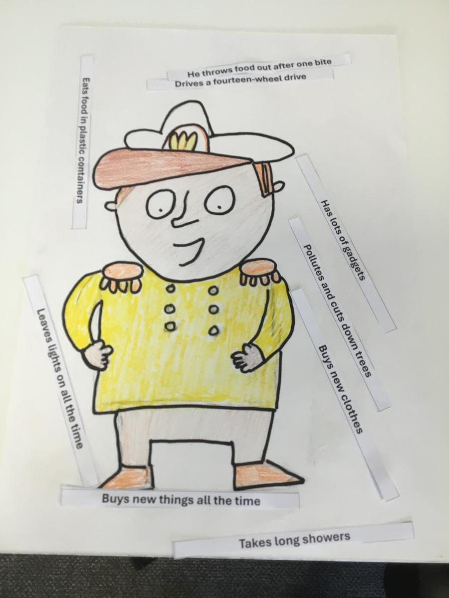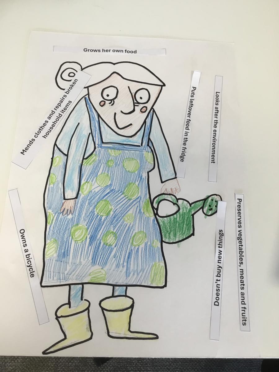 Gram- Gram his grandmother saves him from a life of collecting stuff. She teaches General Waste how to reduce, reuse, and recycle waste. She helps him sort items he needs and donate items he no longer needs to charity. Gram- Gram shows him how to repair broken household items, mend clothes and reuse waste to create new artwork. She teaches him how to grow plants for food and prepare that food from scratch to make meals. General Waste learns how to recycle food scraps to make compost. He notices that growing trees and plants creates habitats for birds, small animals and good insects.