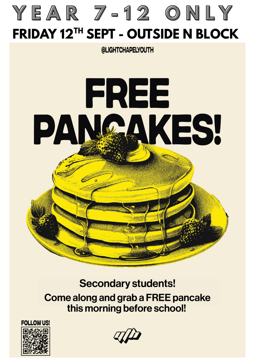 Secondary students are invited to a free pancake breakfast hosted by Light Chapel Youth this Friday outside N Block from 8.00am. We would love to see you there!