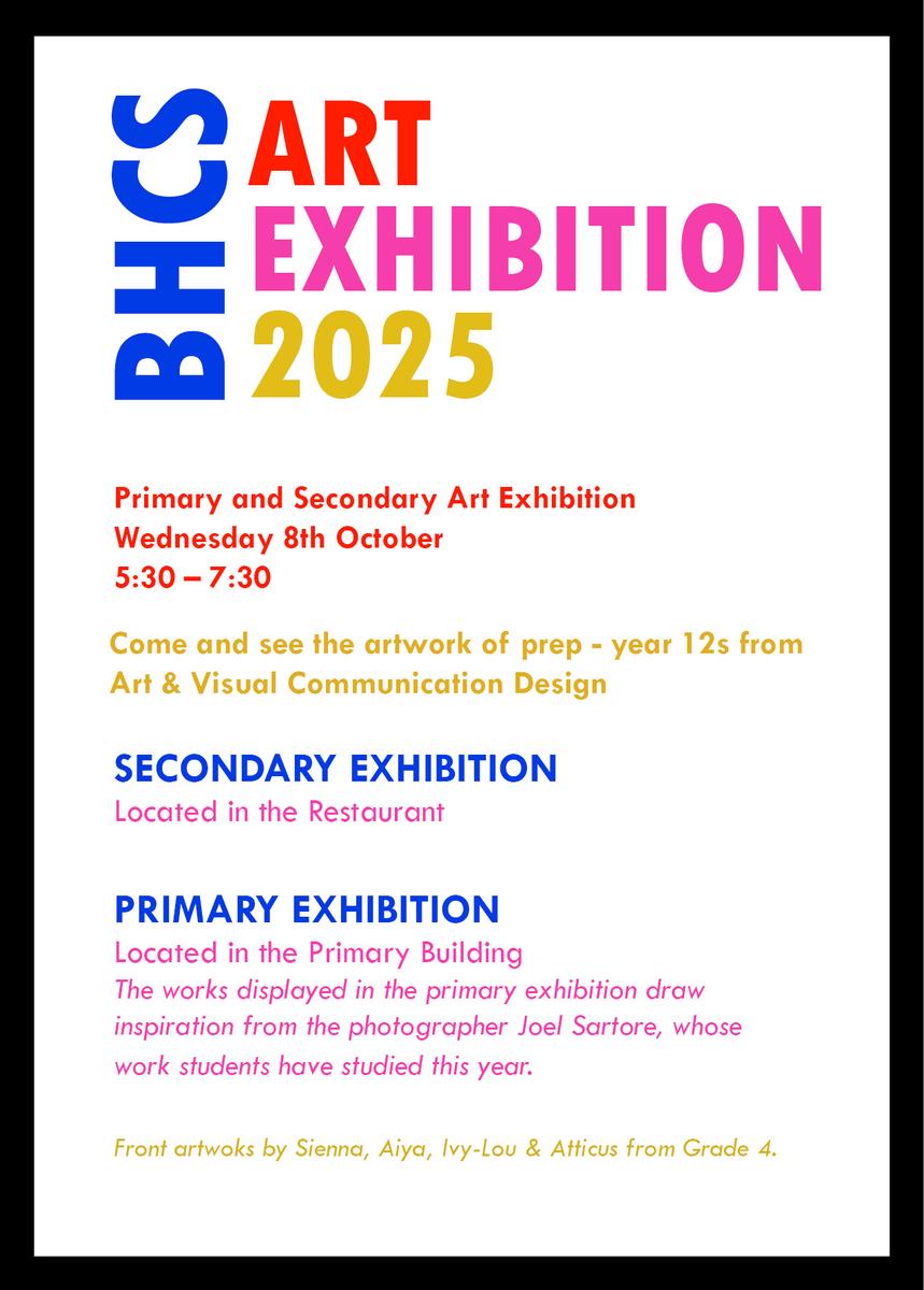 We’re excited to invite you to our Art Exhibition on Wednesday 8th October, 5:30–7:30pm, showcasing artworks from Prep to Year 12.
