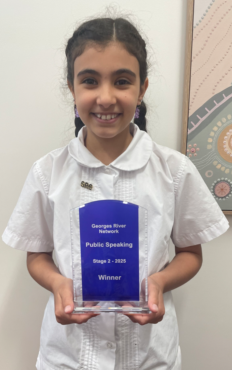 Congratulations to Harper for her outstanding achievement at the Georges River Network Public Speaking Finals, placing first in Stage 2. With her polished prepared speech and quick thinking impromptu, Harper shone. She will be heading to GRC Oatley to compete in the Public Speaking Grand Final next term.