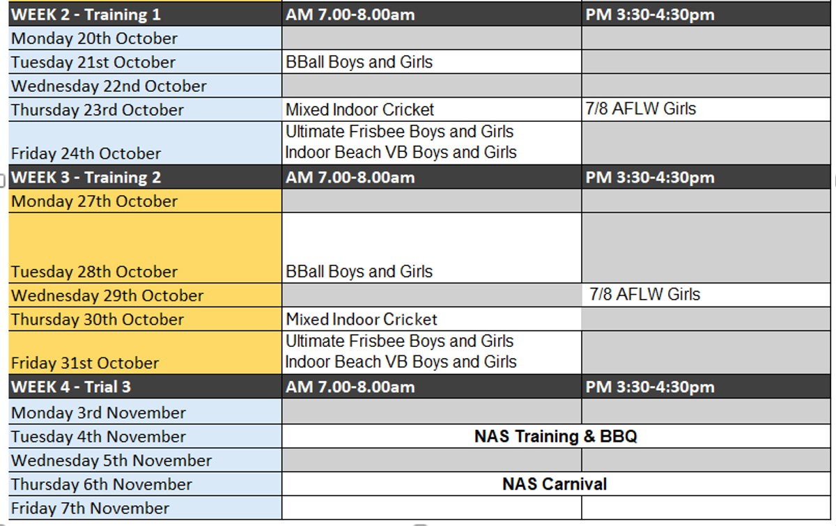 Year 8 NAS Trials will commence next week. All students should have completed the nomination form that was in the notices. All students must be involved on the day, you can nominate to be involved in either a NAS Teams to trial for, a student helper for the day, or to play social volleyball.