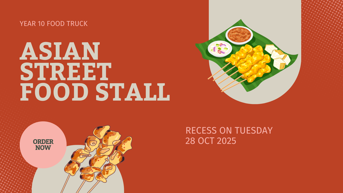Get ready for a delicious recess adventure! The Year 10 Food Truck is rolling into the Café Courtyard with an Asian Street Food Stall on Tuesday 28 October 2025.