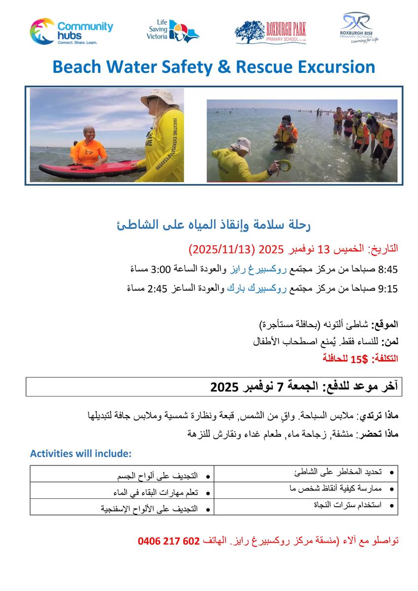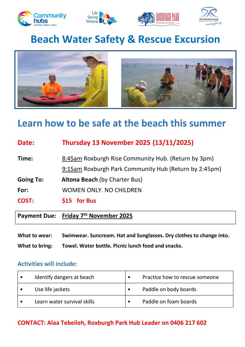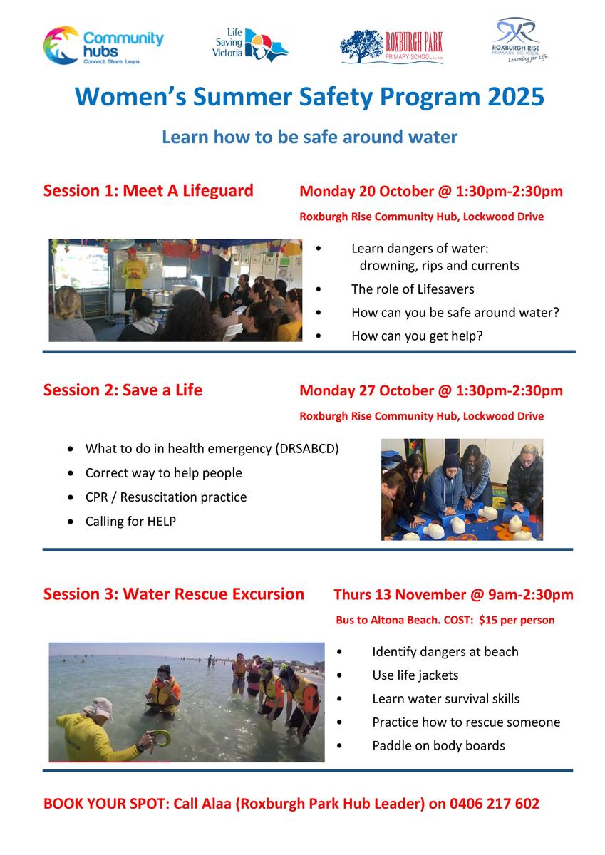 A Women's Summer Safety and Beach excursion has been organised in partnership with Life Saving Victoria and Roxburgh Rise Community Hub. The first two sessions will be held in Roxburgh Rise's Community Hub. The third session will be an excursion to Altona Beach were we put what was learnt in sessions 1 and 2 to practice. The women will also have the opportunity have some fun in the water, have a picnic and eat ice-cream. For more information, please see the flyers below. For enquiries or to to book your place, please call Alaa on 0406 217 602 or drop us a visit in the hub!