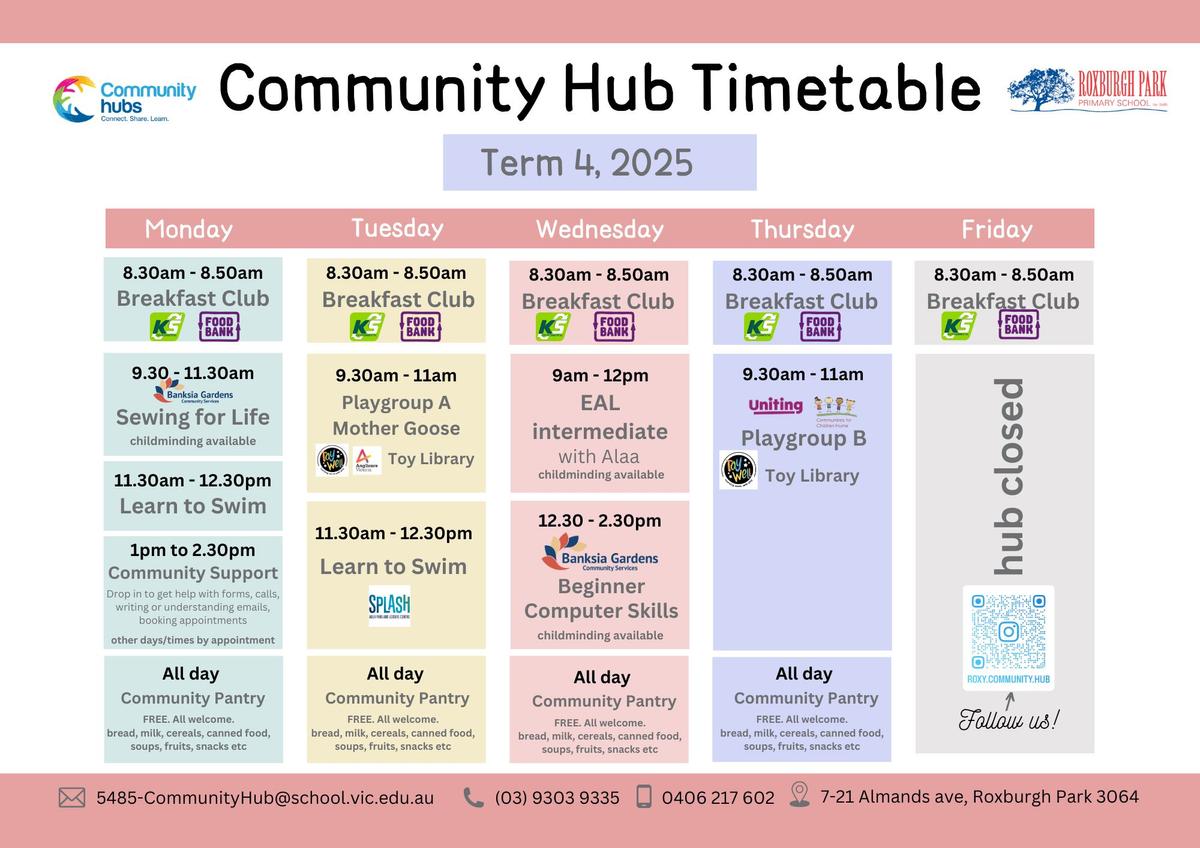 The Community Hub is open from 9am to 2.45pm Monday to Thursday.
