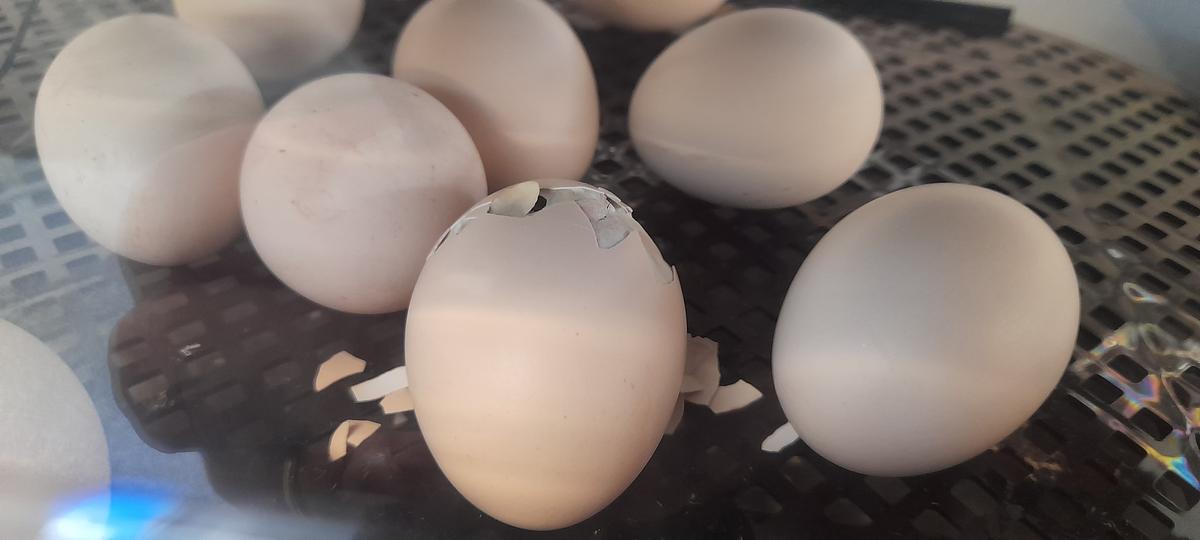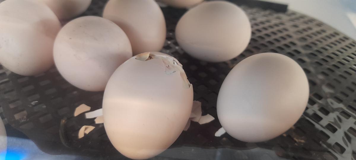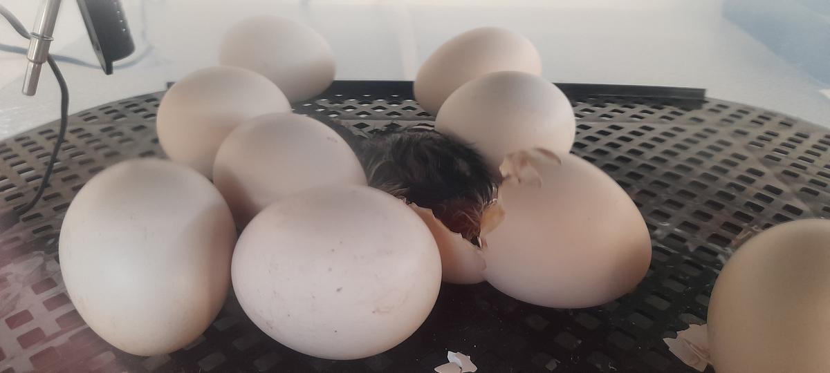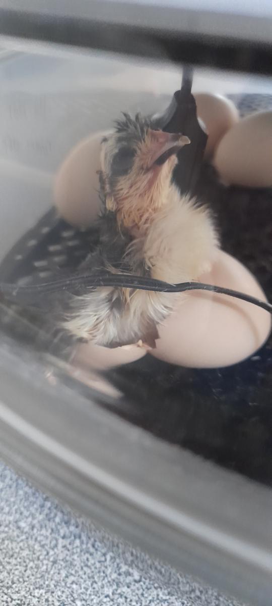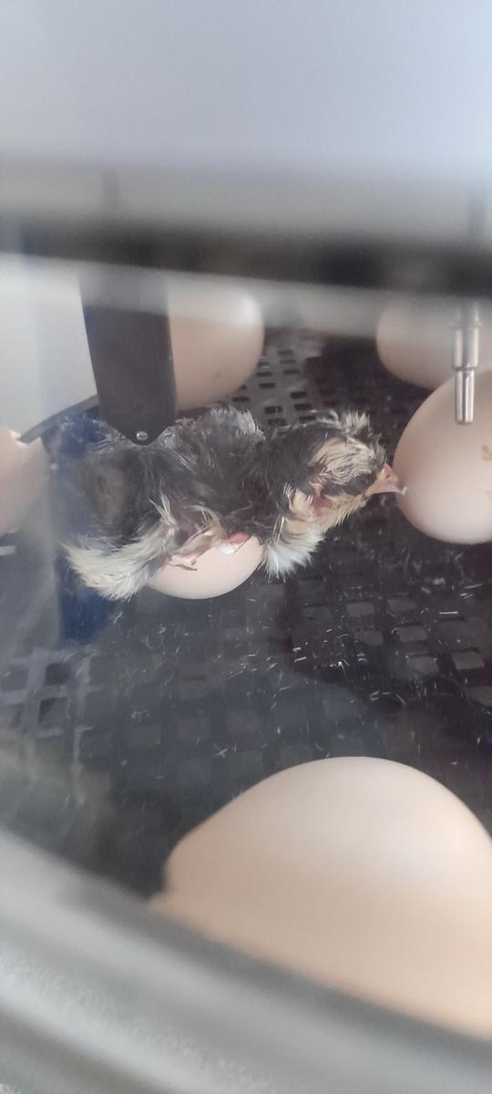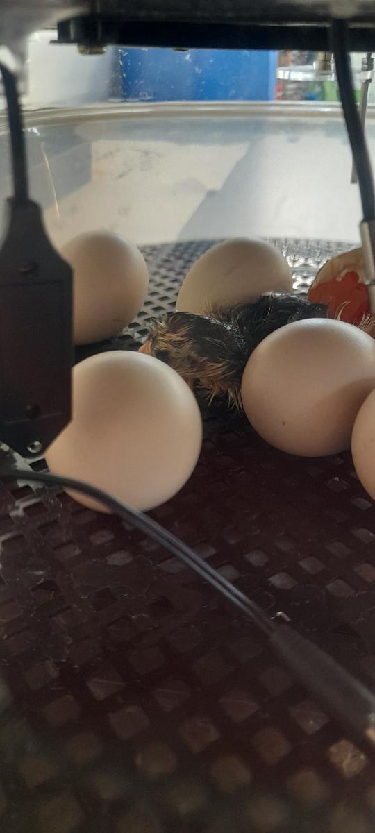 We have had our first chicken born. It is very dark in colour and very tired from pecking it's way out of the egg! It took a few hours from the first peck to the whole chick coming out. Hopefully they all will be out by the time the next newsletter comes out.