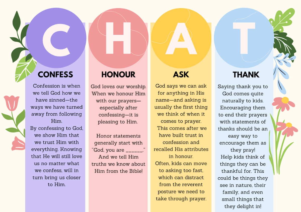 It is a simple, 4-step prayer template for when you don’t know how or what to pray. This may be because you are new to prayer or simply that you are overwhelmed and feel like you don’t know where to start. The acronym C.H.A.T. helps primary school aged children learn more about prayer. It reminds them that it is not a scary thing—it’s a chat with God!