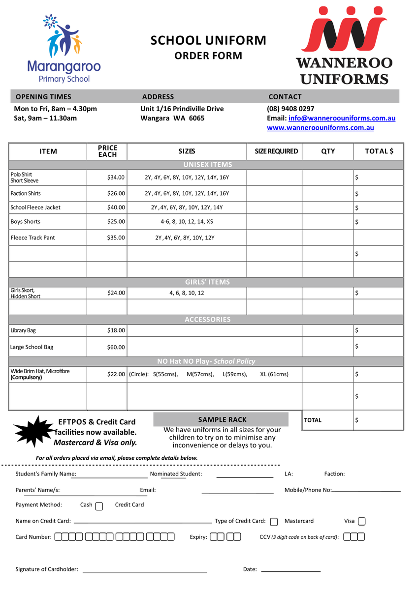 A reminder that the school no longer has a uniform shop operating onsite. For all school uniform needs, please visit the Wanneroo Uniforms shop front at Unit 1/16 Prindiville Drive Wangara.