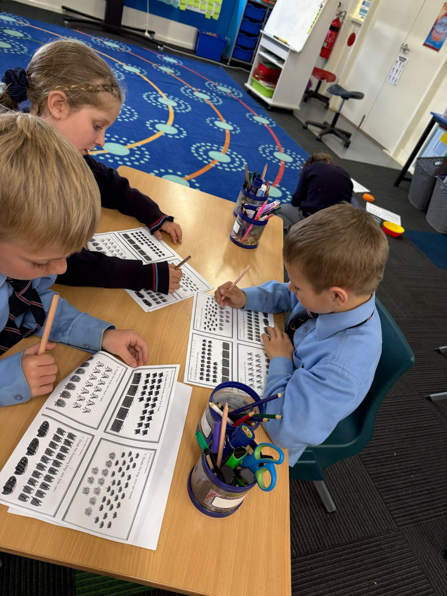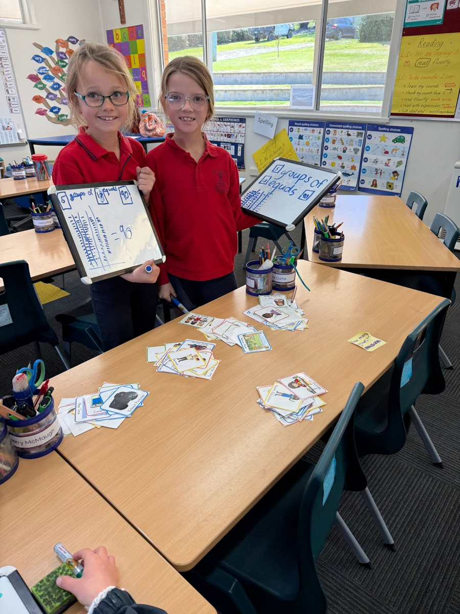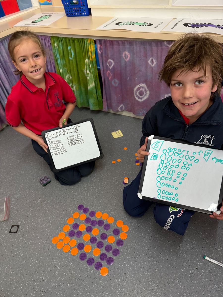 In Maths, Stage 1 has continued with making groups but this time with a focus on dividing groups into equal and unequal shares. Using the previously taught skills of skip counting and arrays have enhanced our knowledge and enabled us to subitise {identify without counting}mentally. The use of concrete materials at this stage is imperative to being able to fully understand why the skill of division is important {nobody wants to have less lollies than others!} and to help solve open-ended tasks such as I have 20 lollies that need to be shared. By answering this question, our students will identify number facts in numerous ways, illustrate their working out and show evidence of equal/unequal groupings. The next step is being able to complete division problems without the use of concrete materials. It is at this stage that students often show difficulty as the representation of the pictures may not be in a formal array, thus stretching them to use more complex strategies.