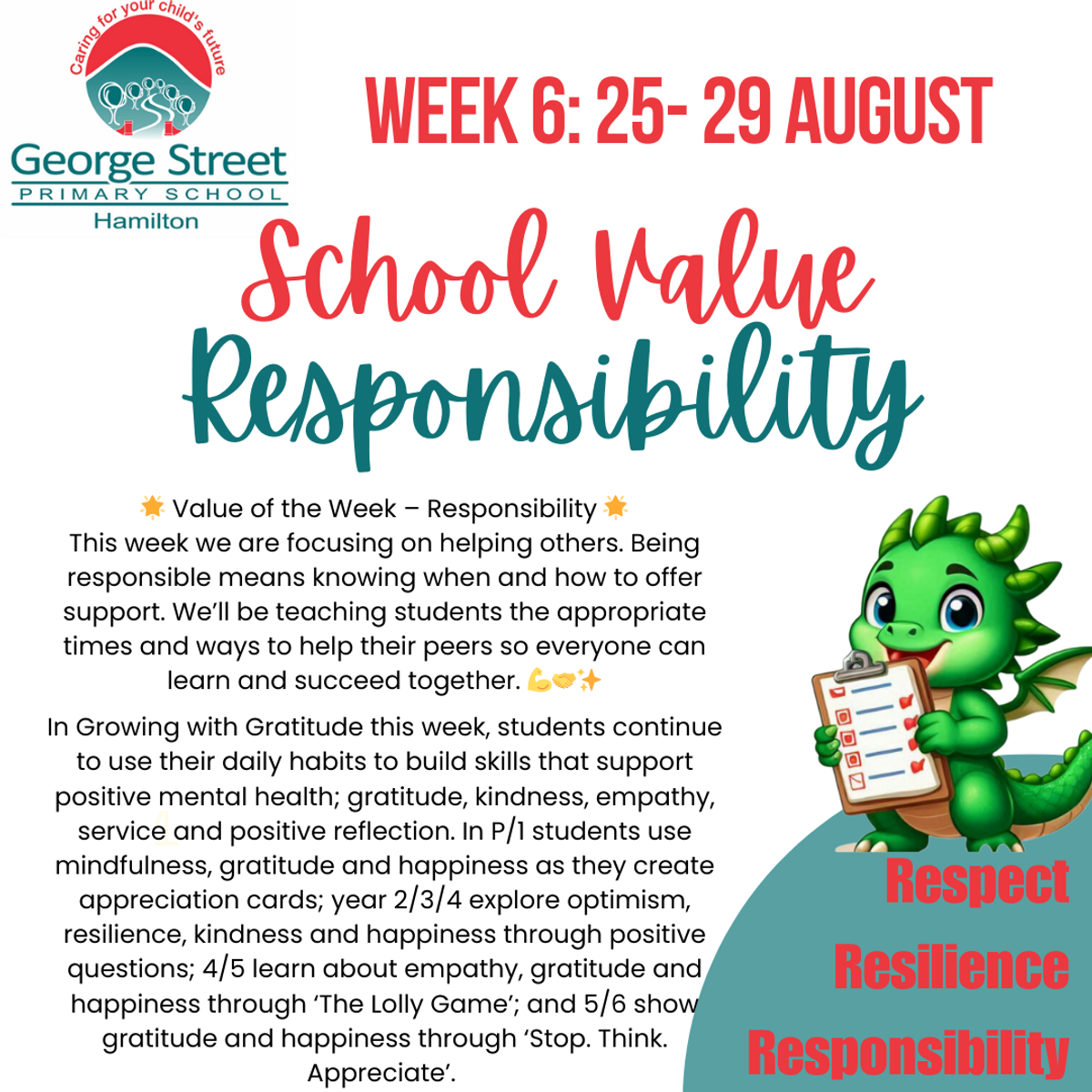 Students have been engaging in weekly Growing with Gratitude lessons this term as part of our overall Social and Emotional Learning curriculum, and continue to focus on one core value and expectation per week. See the images below for more detail on our most recent focus areas!