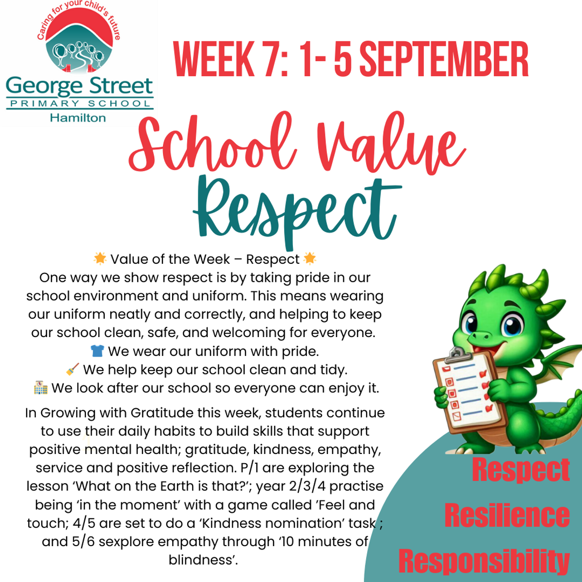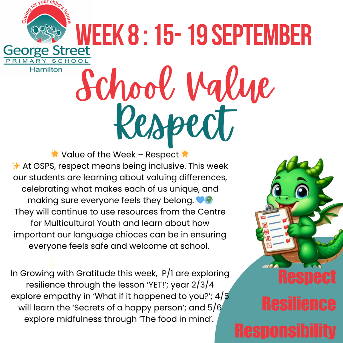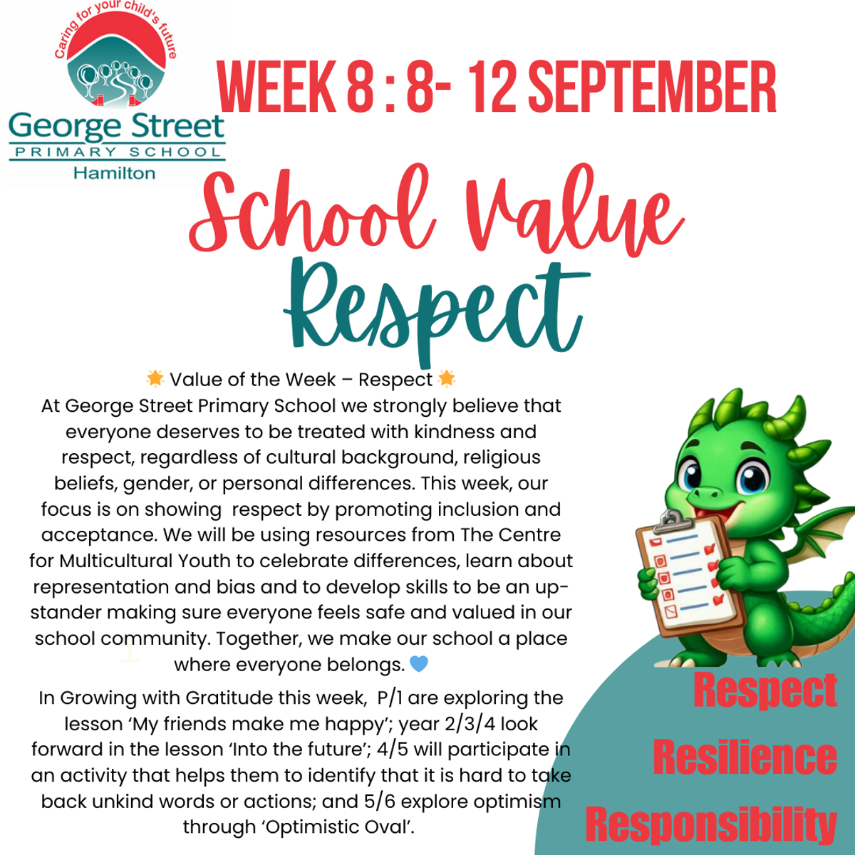 At George Street Primary School we strongly believe that everyone deserves to be treated with kindness and respect, regardless of cultural background, religious beliefs, gender, etc. That’s why we have a zero tolerance for any form of racism. This includes comments, slurs, attempted jokes or any other form of harassment. If students are found to be engaging in these behaviours there will be serious consequences including discussions with teachers, caregivers and disciplinary action. We want to ensure that our school remains a safe and welcoming environment for all. Let’s work together to celebrate the differences that make us unique and stand up for one another when we see, hear or witness anyone challenging these values.