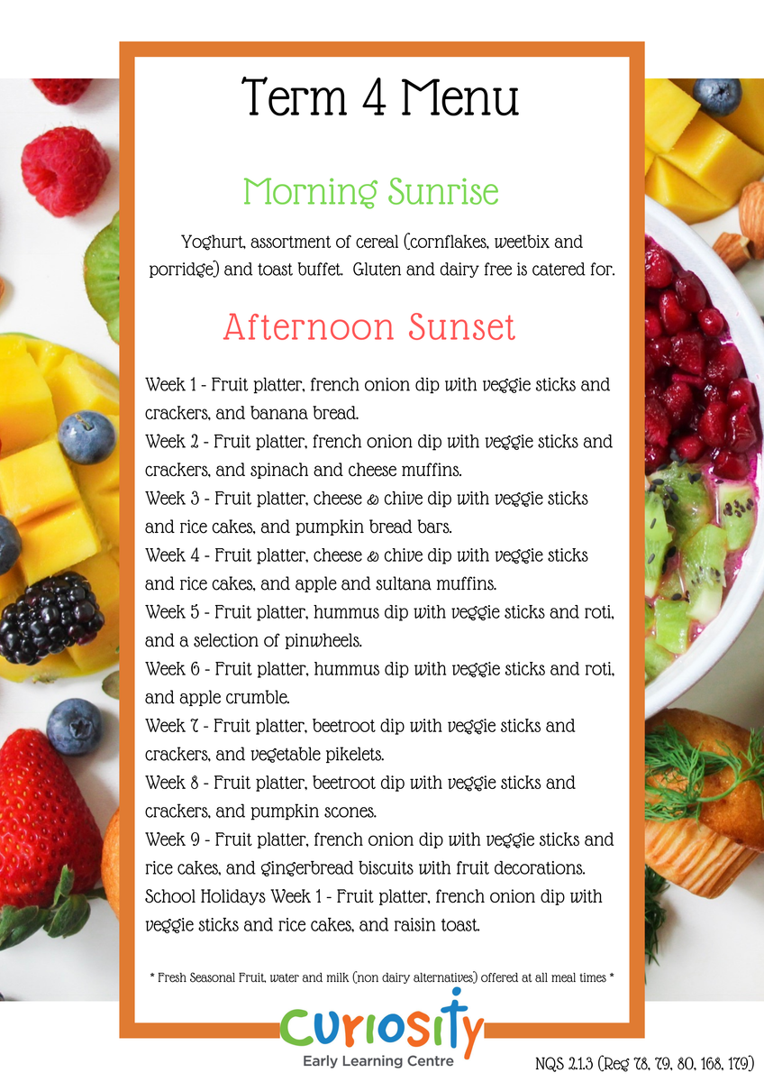 Our Term 4 event calendar and menu are now available! Families can view upcoming special events, celebrations, and learning experiences planned for the remainder of the year, along with the delicious and nutritious meals our children will enjoy each week.