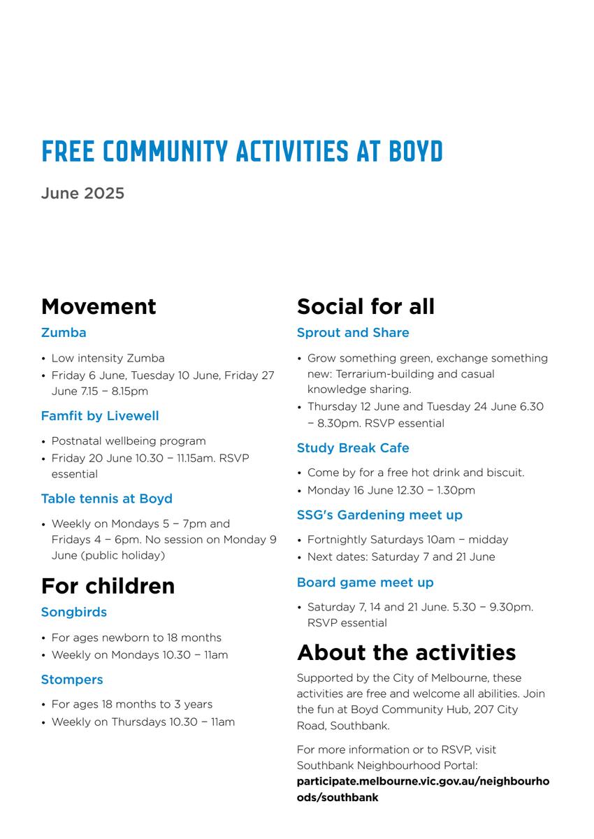 You can find out more about activities and RSVP on Southbank Neighbourhood Portal.