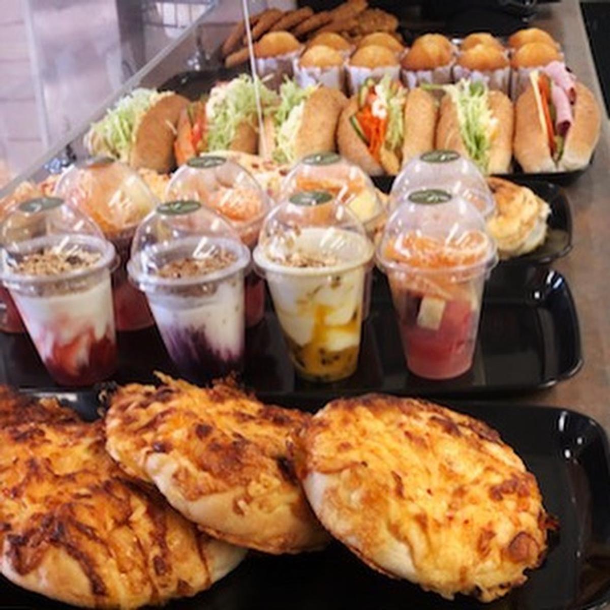 We currently offer cheese and bacon rolls, cheese and vegemite scrolls, banana bread, fruit salad pots, watermelon slices, yoghurt and granola pots. In addition to this we offer a range of hot toasted wraps and toasties, hot chocolate and coffee, juices and up and go.