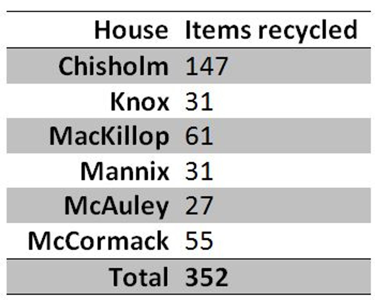 The above mentioned projects complement the College's Computer Ink Cartridge Collection via the Library and the House Competition to collect bathroom product containers for Terracycle. The first collection of beauty products has been sent off to Terracycle and the House Tally is pictured below. Well done to Chisholm!
