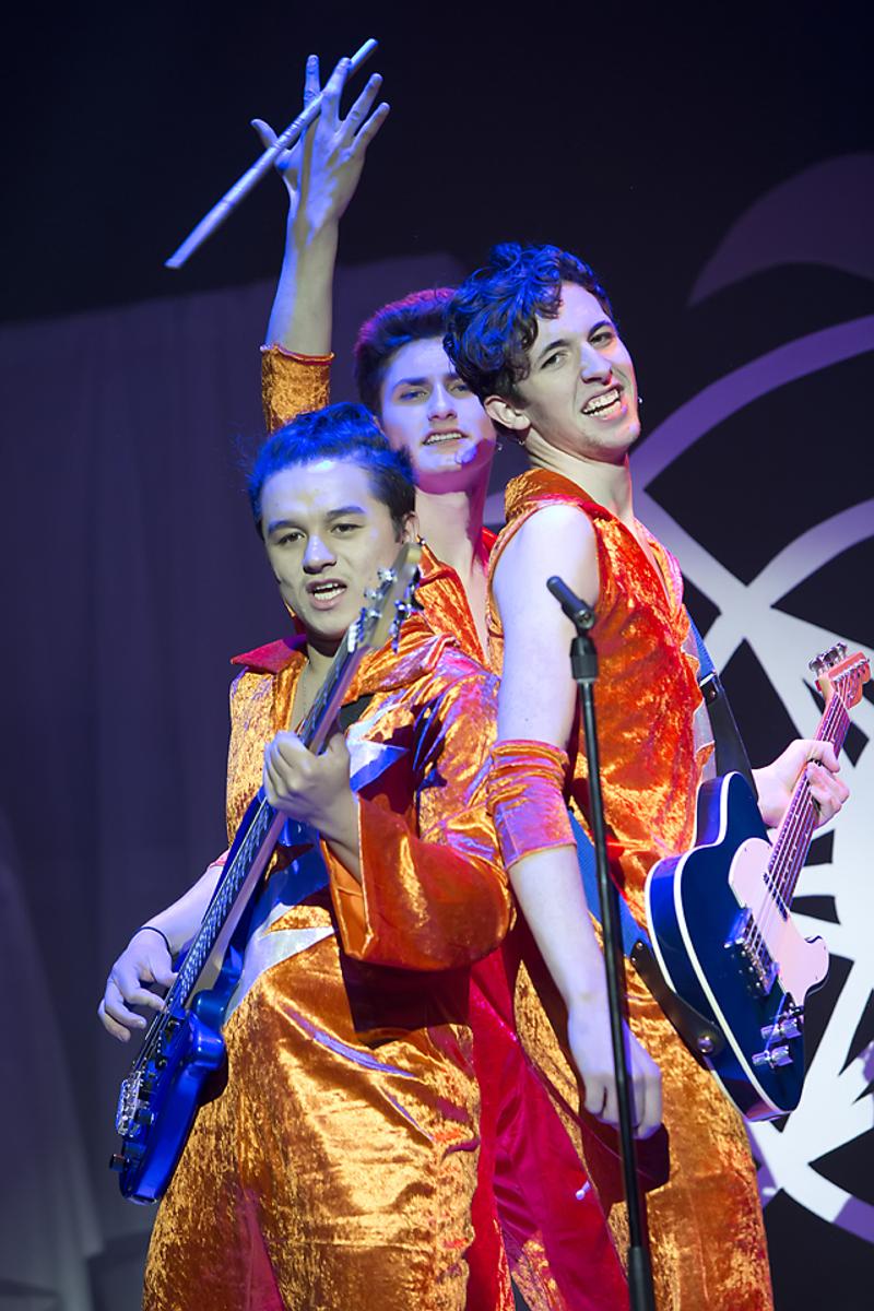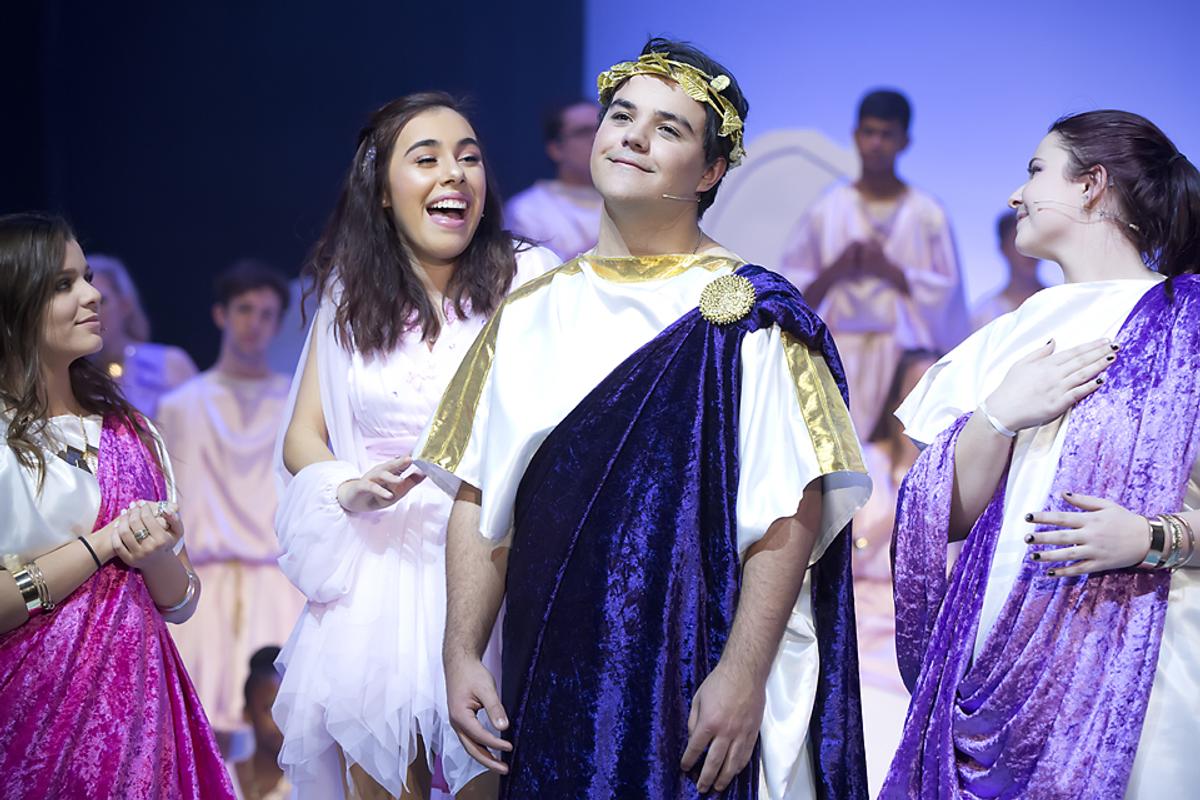 Tom Leigh played a rock star Tube and then donned a pink toga with wand in hand as Hermes. Julia Turcarolo in the role of Aphrodite the Goddess of Love, along with Phoebe Geralis who performed admirably as Thetis, Goddess of the Sea, had the task of convincing an authoritative God that Sonny Malone and Kira should be allowed to fall in love as mortals. Through his craft, Jordan Fama showed that indeed Zeus could be 'mellow'! The fabulous hits of ELO and Olivia Newton John will never lose their audience appeal.