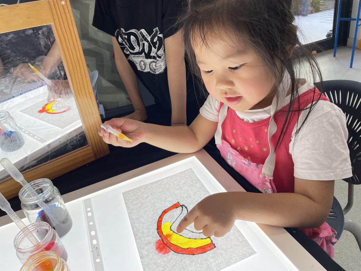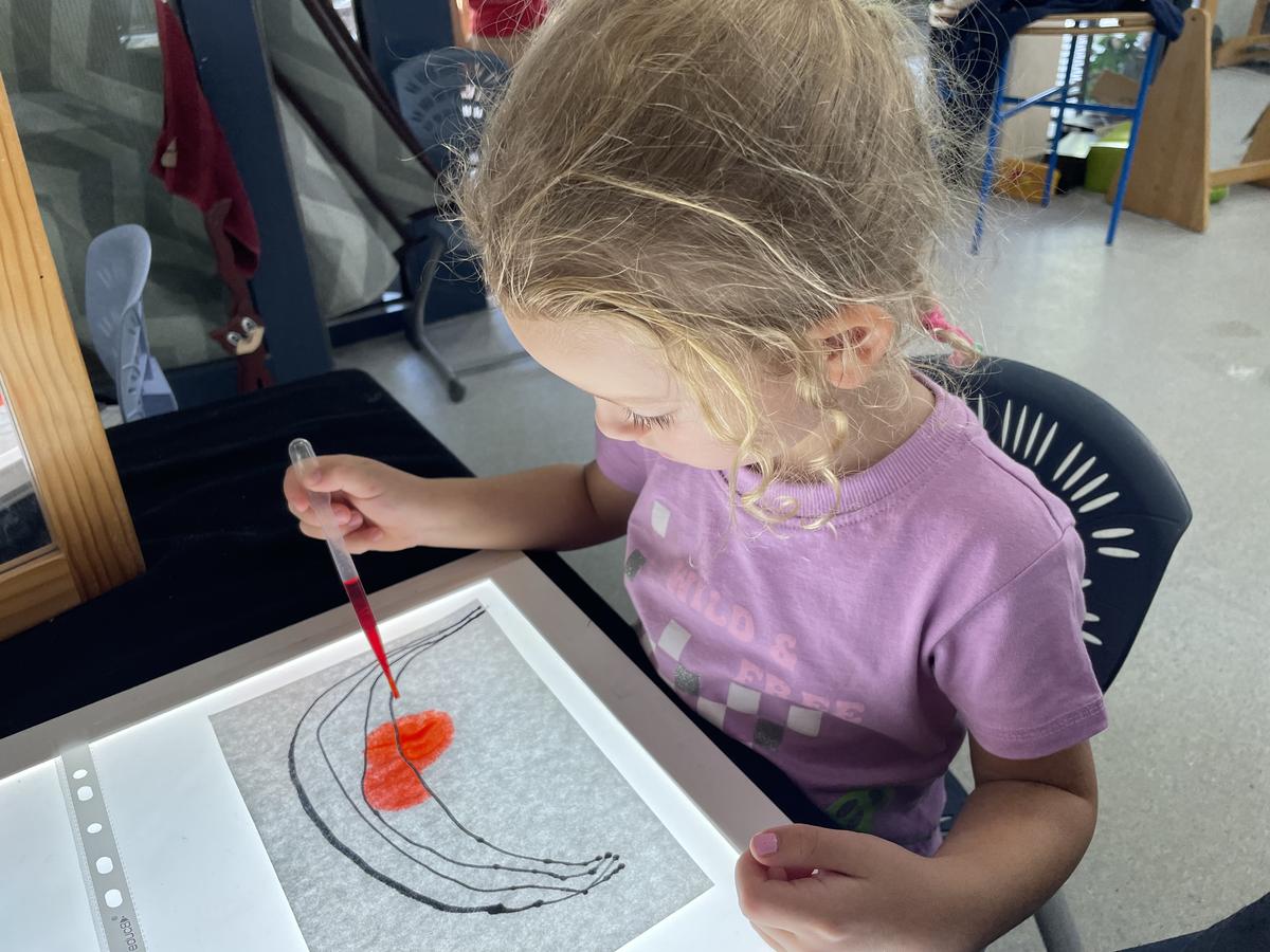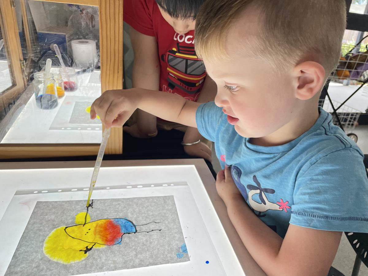 We created our own artworks on special colour-diffusing paper. The children exercised their agency in this creative process by independently selecting and designing an image, drawing it with a black marker, and colouring it in. They practised their fine motor control over small tools by varying the amount of pressure they apply on the pipette dropper to create different effects on the paper. These artworks are now up on display in the room. Please feel free to check them out next week.