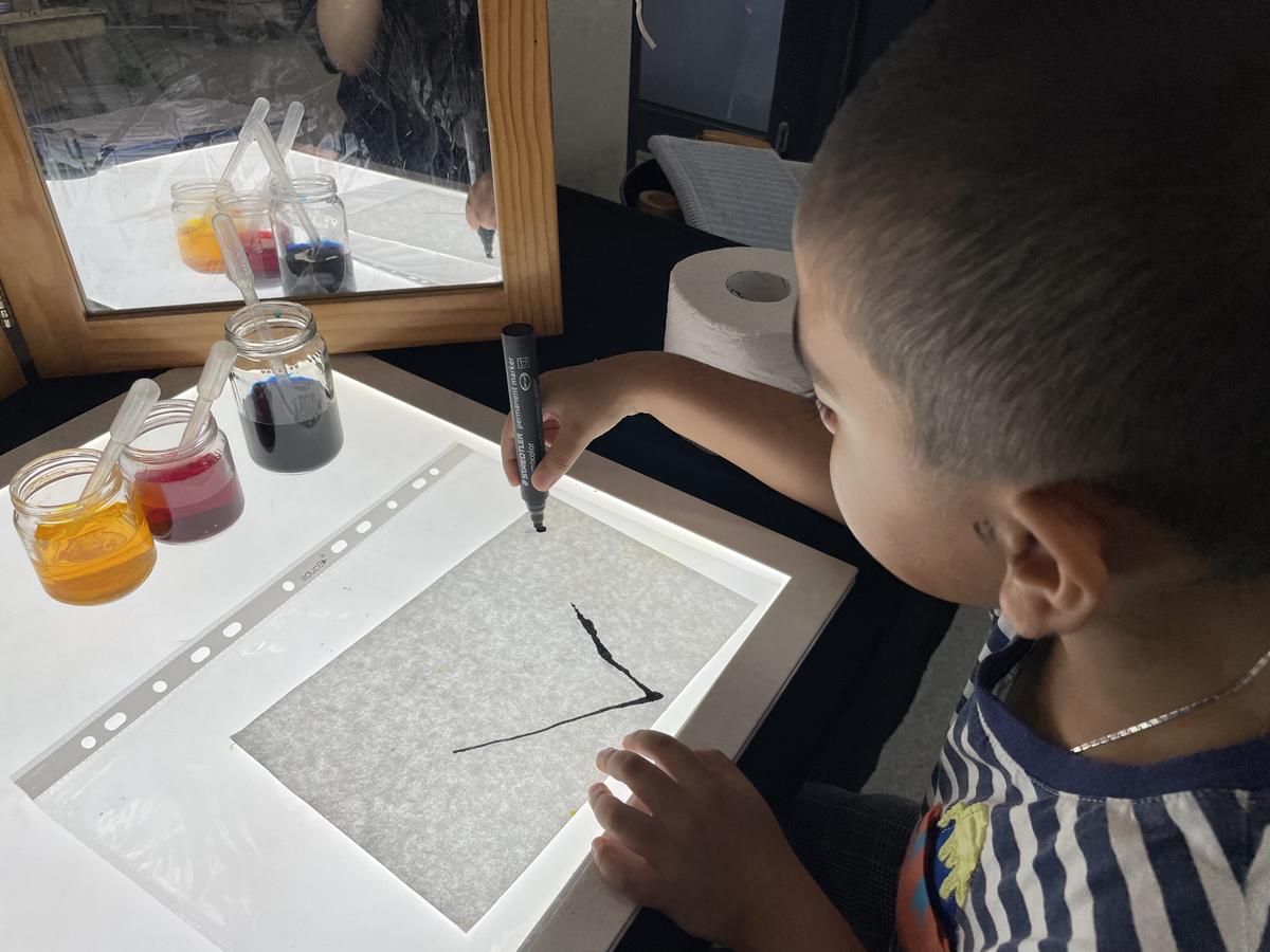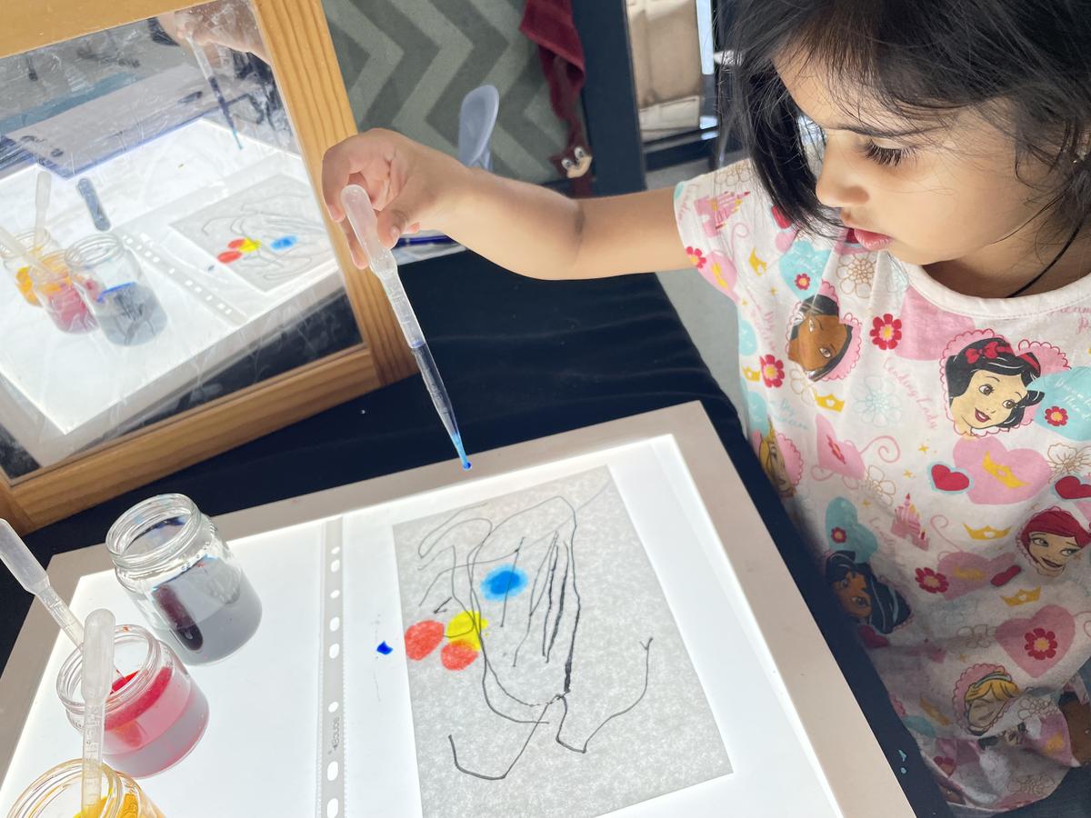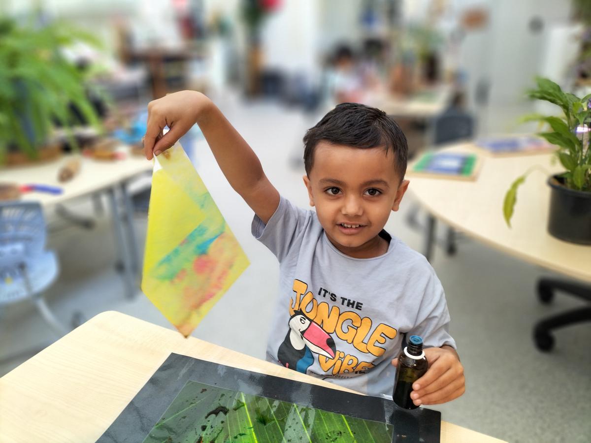 We created our own artworks on special colour-diffusing paper. The children exercised their agency in this creative process by independently selecting and designing an image, drawing it with a black marker, and colouring it in. They practised their fine motor control over small tools by varying the amount of pressure they apply on the pipette dropper to create different effects on the paper. These artworks are now up on display in the room. Please feel free to check them out next week.