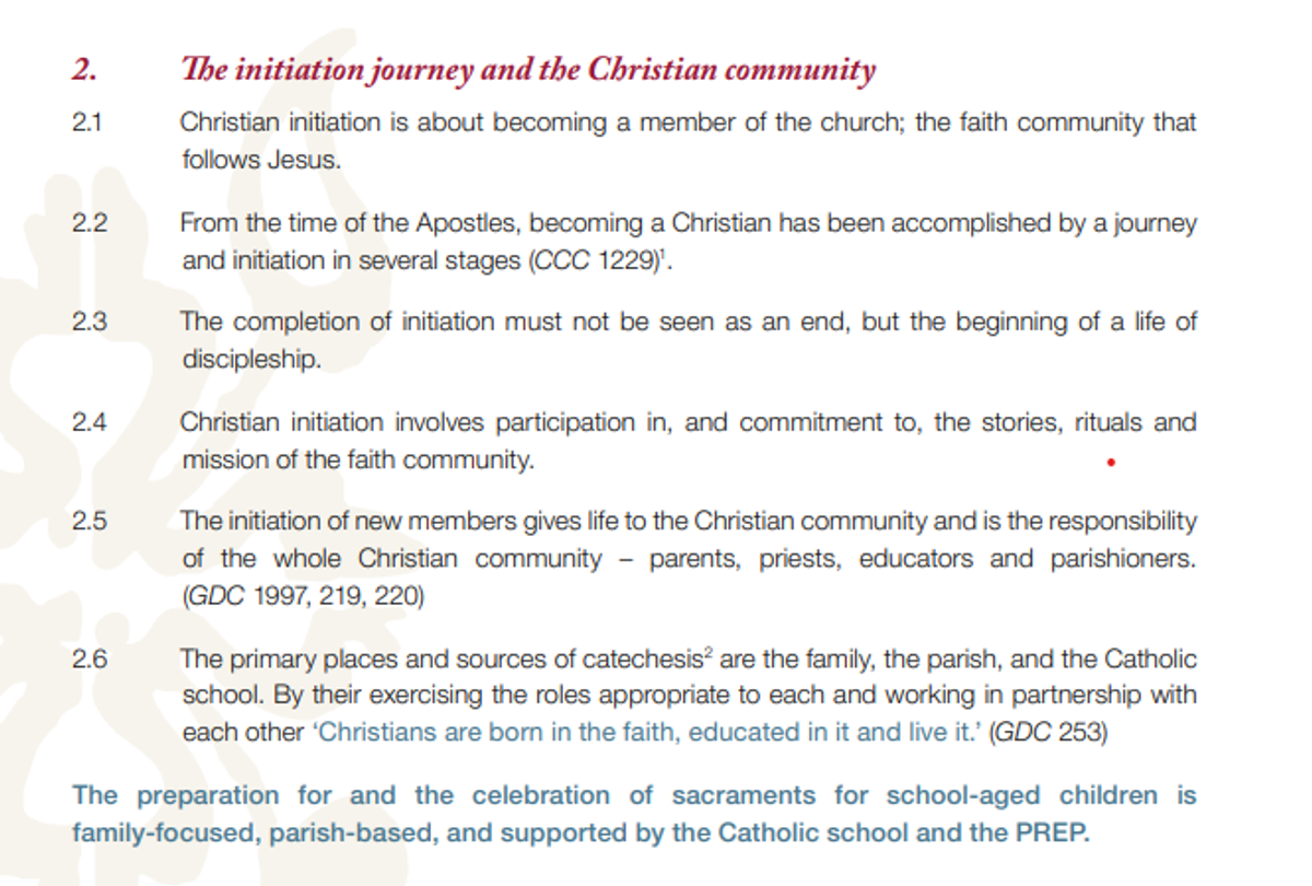 In the Archdiocese of Perth, the model for Sacrament preparation is family-focused, parish-based, and school/PREP* supported. The Policy was formalized in 2014, and outlines how family, parish and school work together.