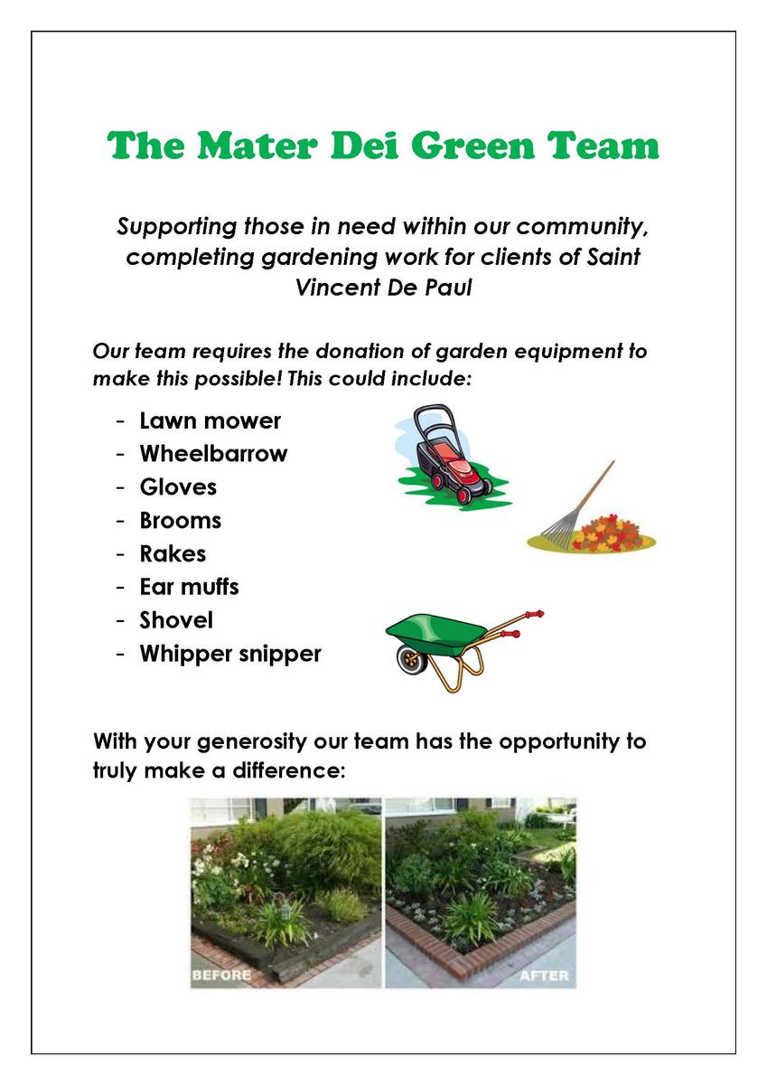 The Green Team will complete gardening work for clients of Saint Vincent de Paul. It’s aim is to be active members within our community, supporting those most in need. An opportunity for volunteer training through Vinnies will be held this term. After the training, the team can then complete gardening work such as pruning, mowing, planting, weeding etc.