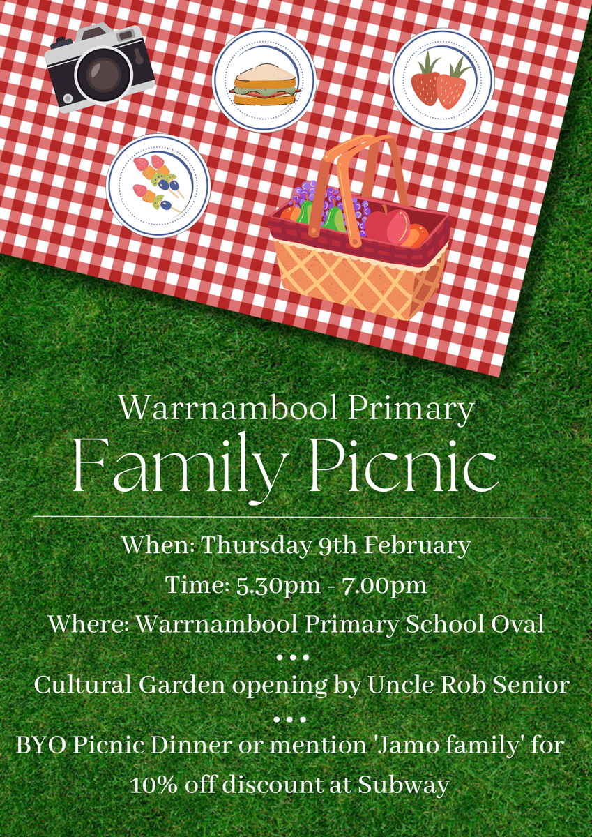 We are holding a welcome back picnic next Thursday 9th February 2023 from 5.30pm on the school oval. You are invited to bring your own dinner to share with your family. Subway at Norfolk Plaza are kindly offering a 10% discount for families, just make sure you mention Jamo Picnic when ordering.