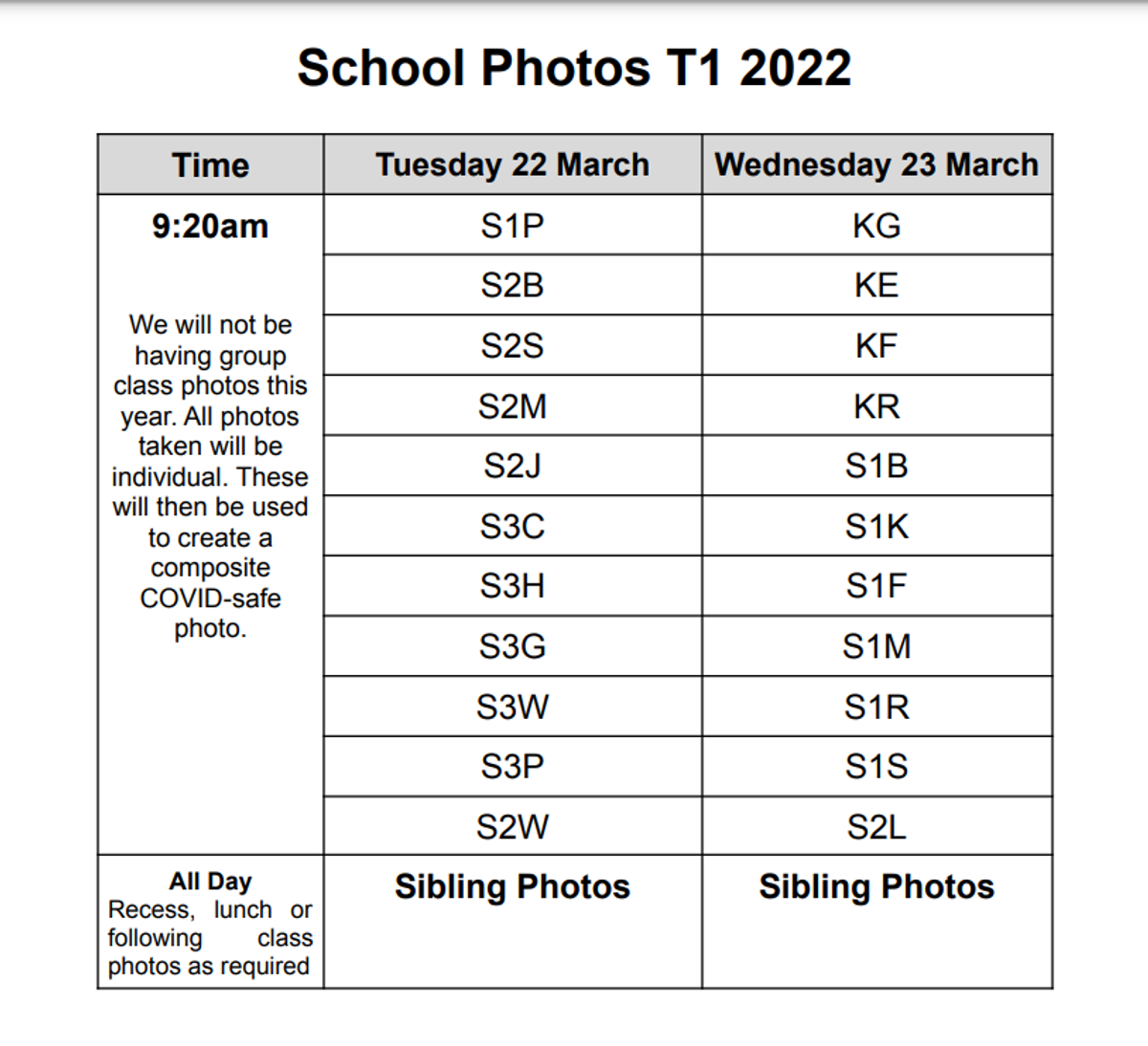 Ben Venue's annual school photos will be held tomorrow, Tuesday 22 March and Wednesday 23 March. Students are asked to wear full school uniform on their designated photo day. Sibling photos can be taken on either day, during recess and lunch or between class sessions if required. Please see the timetable below for an outline of when your child's class will have their photo taken. This year, there will be no group photos. Single photos will be taken and used to create a composite photo for each class.