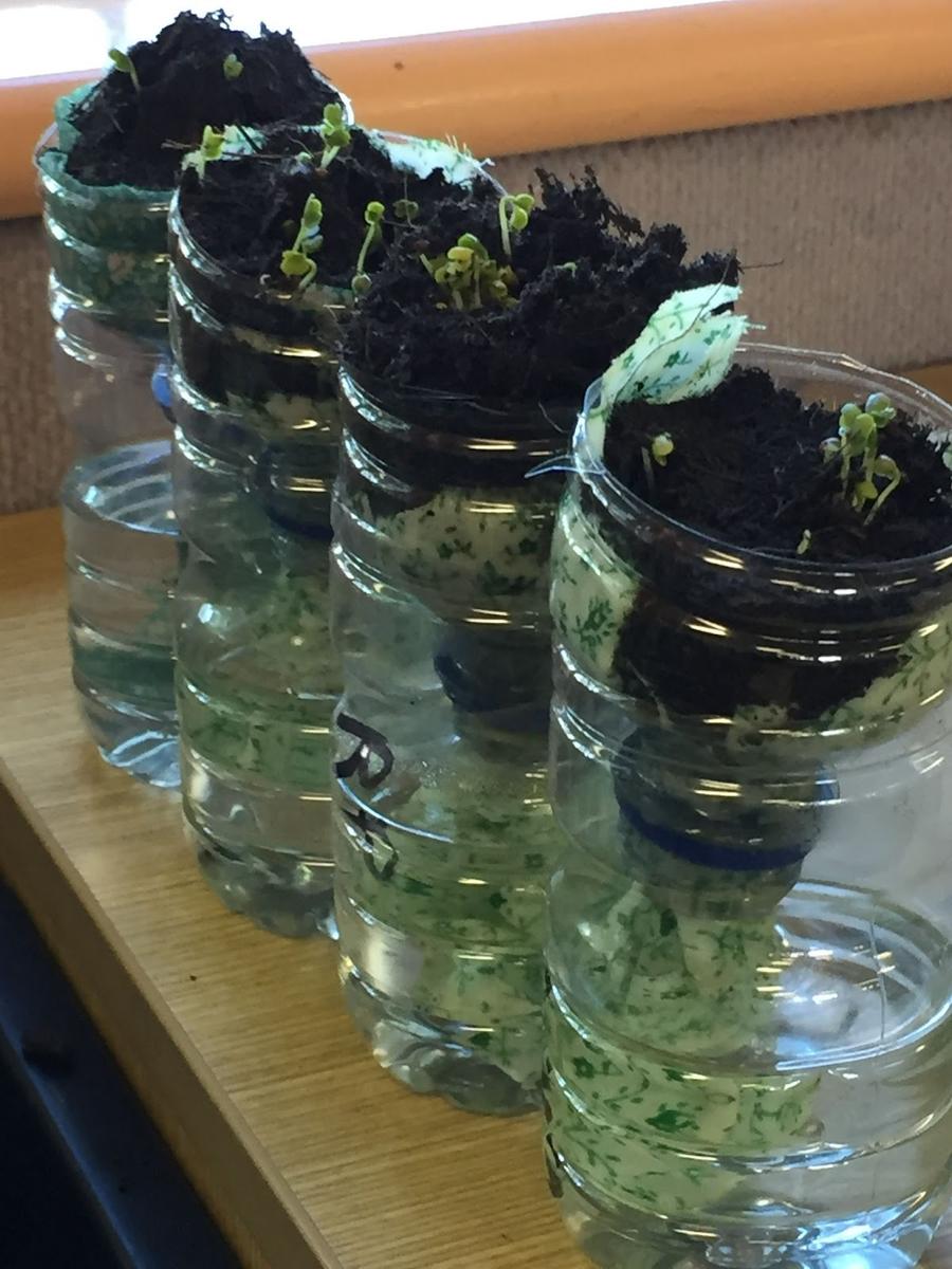 Water efficient wicking pots using reused plastic bottles and reclaimed cotton fabric.