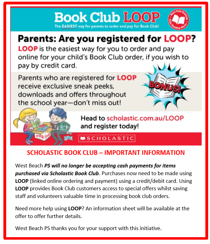West Beach PS will no longer be accepting cash payments for items purchased via Scholastic Book Club. Purchases now need to be made using LOOP (linked online ordering and payment) using a credit/debit card. Using LOOP provides Book Club customers access to special offers whilst saving staff and volunteers valuable time in processing book club orders.