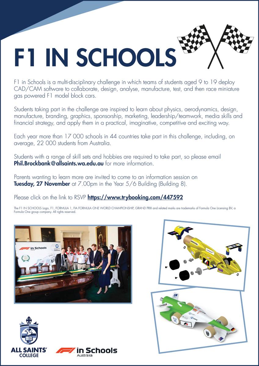 F1 in Schools is a multi-disciplinary challenge in which teams of students aged 9 to 19 deploy CAD/CAM software to collaborate, design, analyse, manufacture, test, and then race miniature gas powered F1 model block cars.