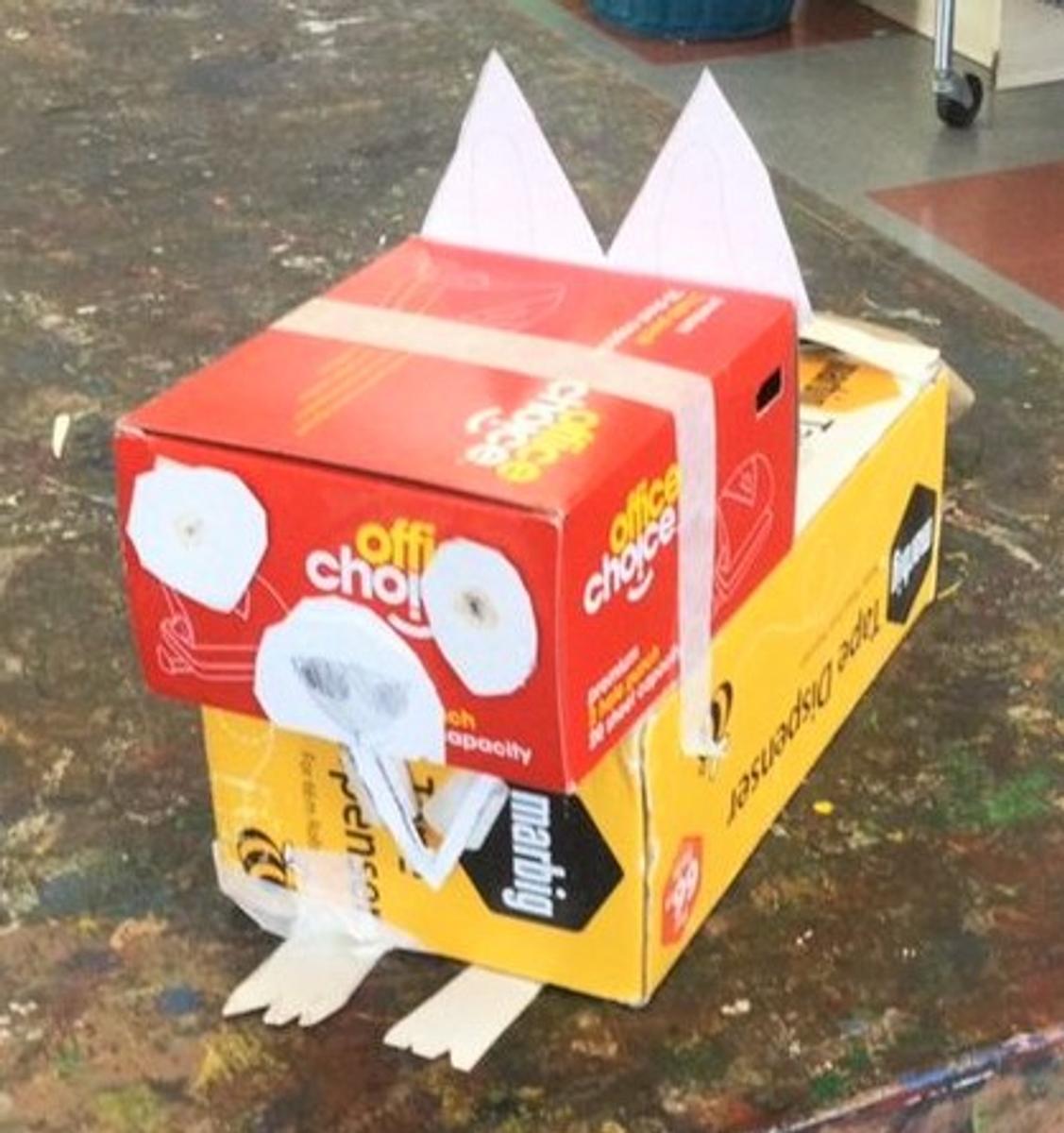 Adapting swiftly to the notion that in art things don't always have to look the way they look in reality, for example heads don't have to be round, students got creative. They measured and swapped boxes and experimented with the best way to attach materials, using tape and or a glue stick. The resulting 'box creatures' are creative and resourceful.