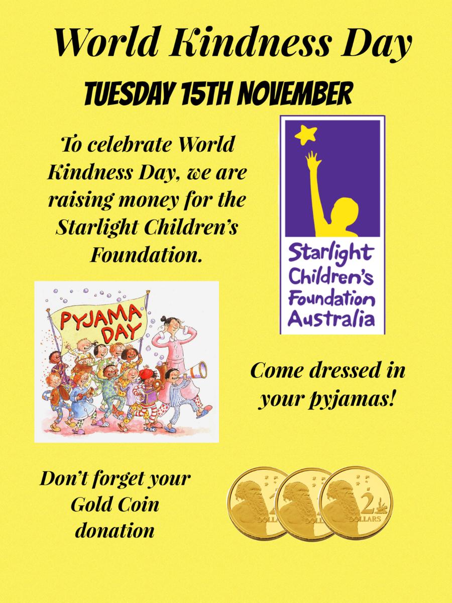 So come to school in comfy dress and remember to bring a gold coin donation to raise money for the Starlight Children’s Foundation.