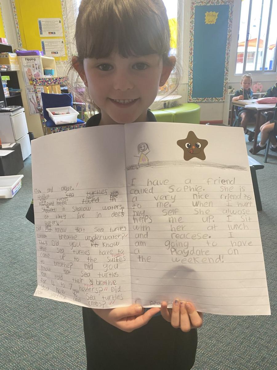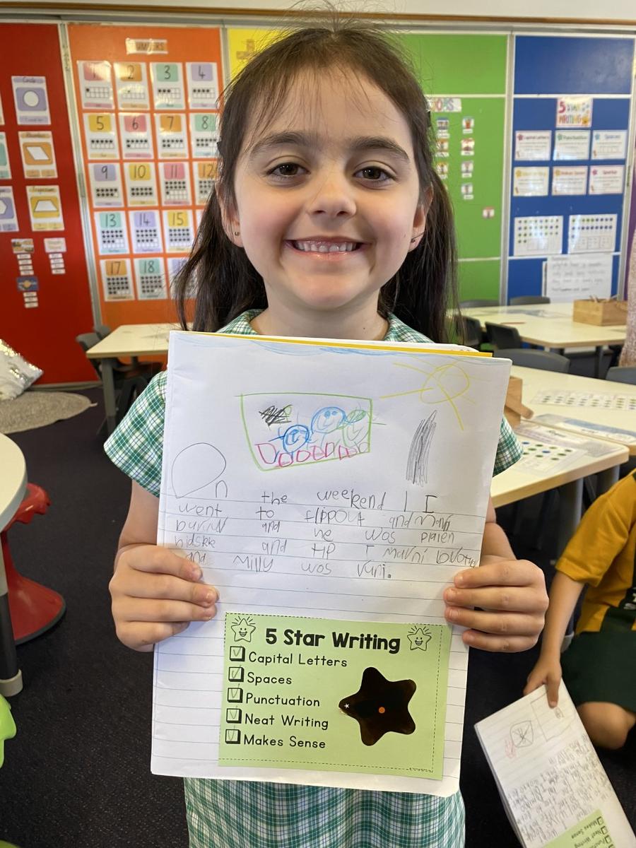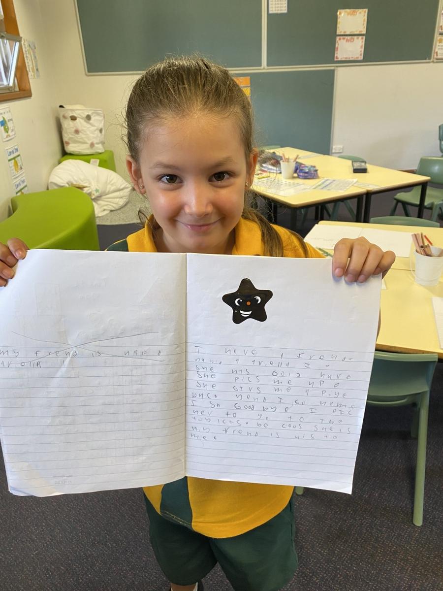 This term Miss Connor is enjoying working with the Year 1 and 2 students and teachers and helping them to improve their writing. The children are working hard to become ‘5 Star Writers’ by remembering to always include punctuation, spaces, capital letters and neat writing. They are also learning to always check their writing to make sure it makes sense. Each lesson the teachers choose a student who has tried hard to be a 5 star writer to receive a giant, shiny gold star sticker on their work. Well done to all the students who have achieved this.