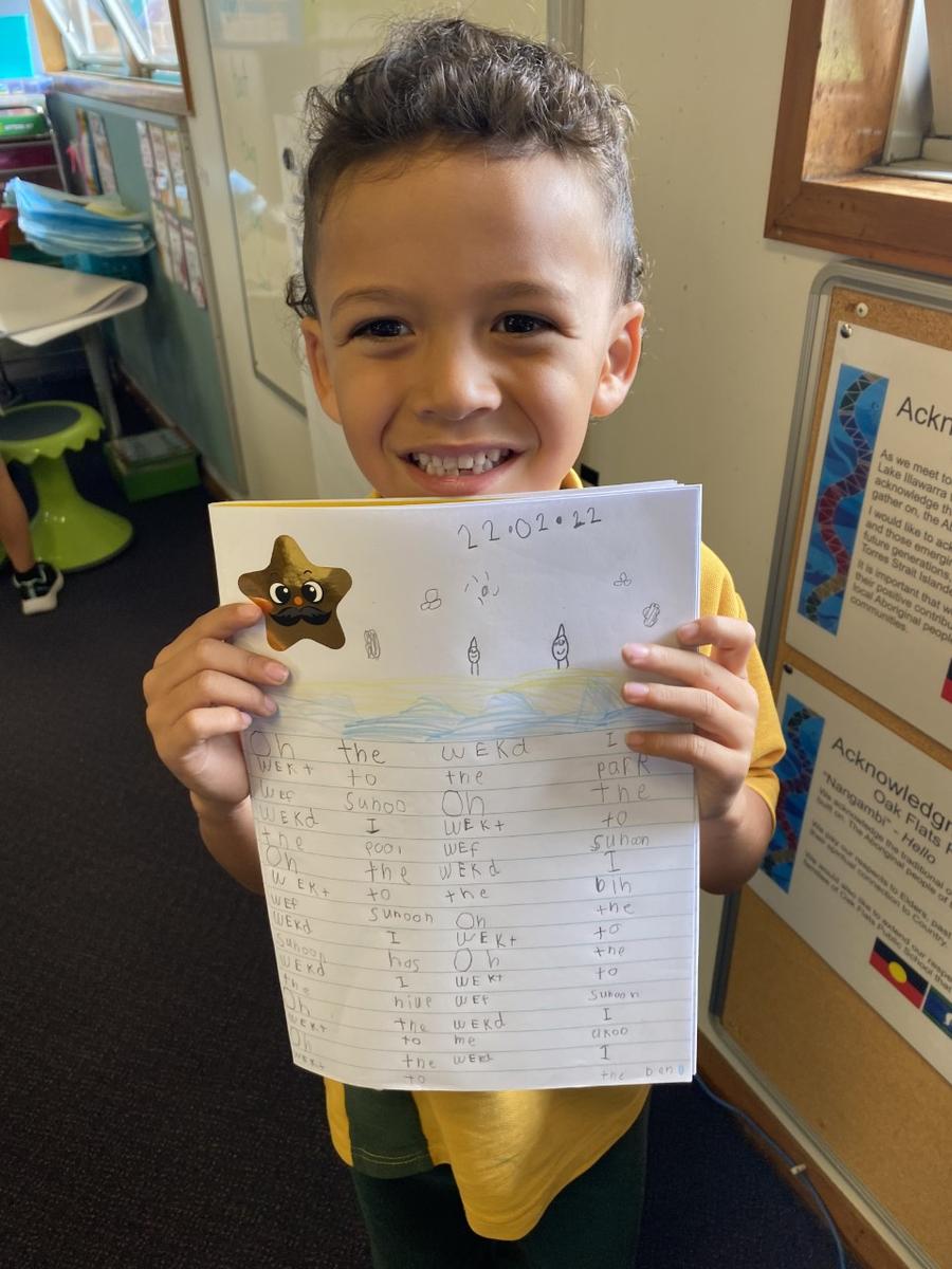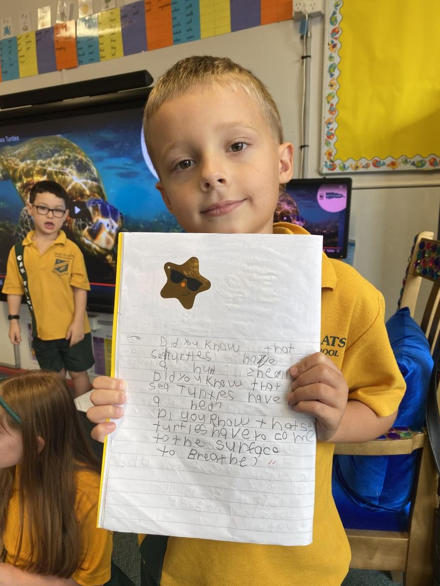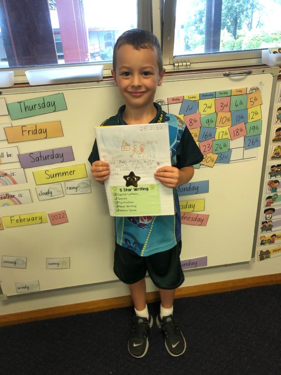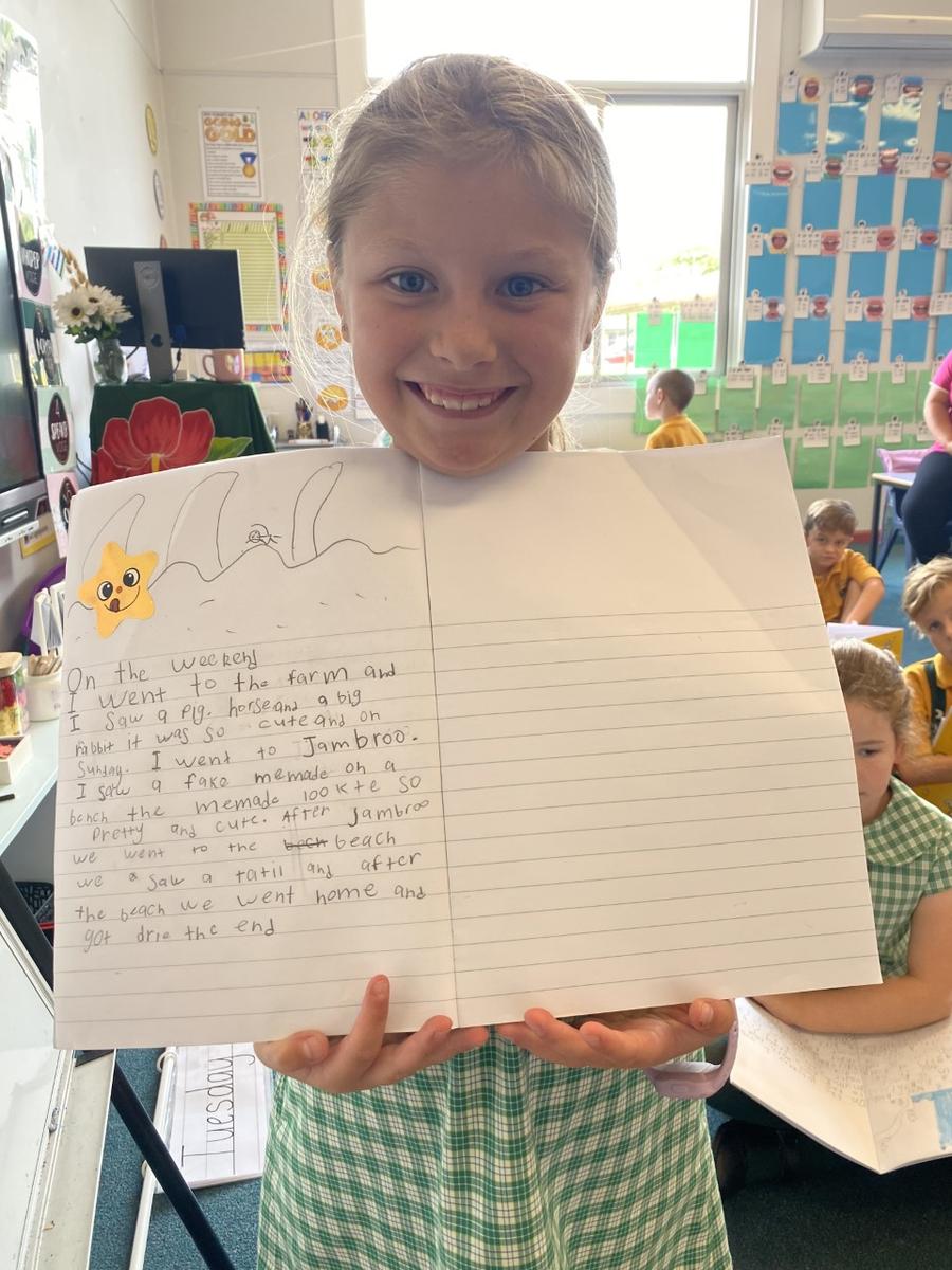 This term Miss Connor is enjoying working with the Year 1 and 2 students and teachers and helping them to improve their writing. The children are working hard to become ‘5 Star Writers’ by remembering to always include punctuation, spaces, capital letters and neat writing. They are also learning to always check their writing to make sure it makes sense. Each lesson the teachers choose a student who has tried hard to be a 5 star writer to receive a giant, shiny gold star sticker on their work. Well done to all the students who have achieved this.