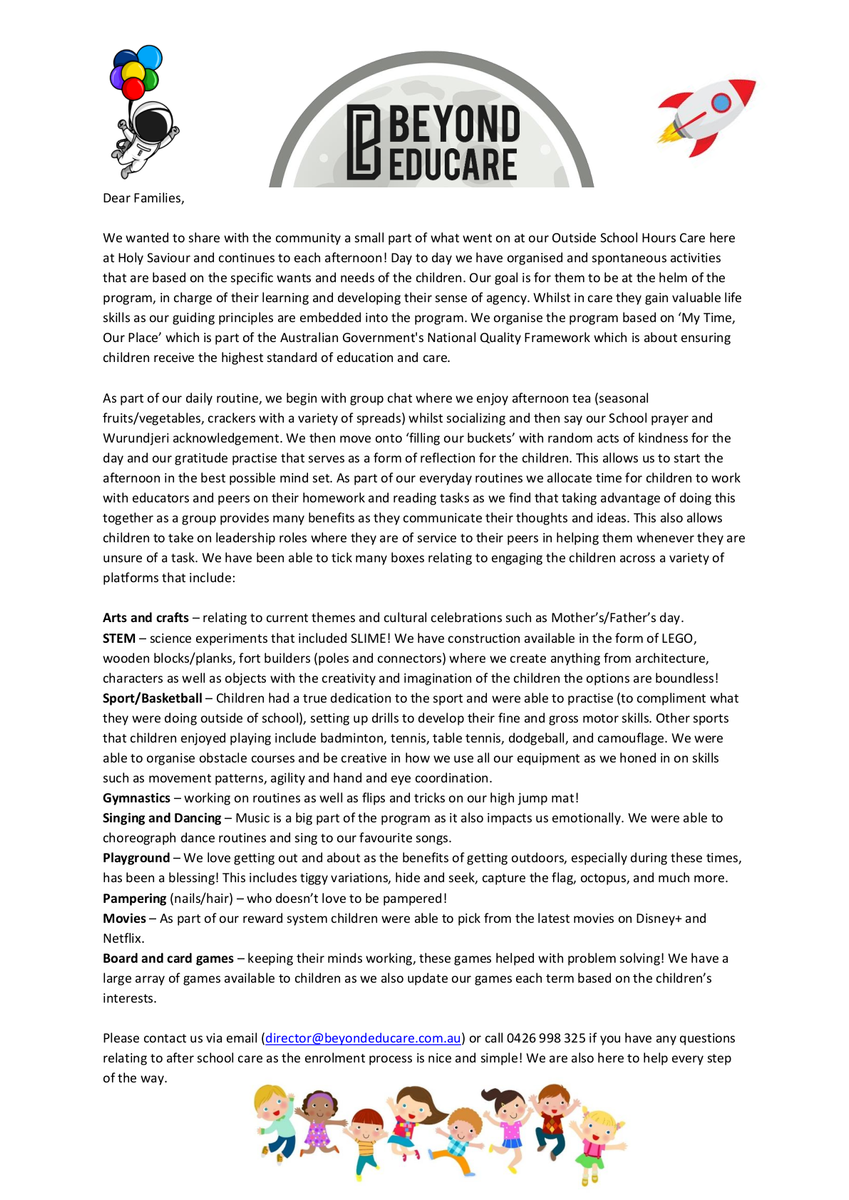 If you are interested in our wonderful after school program run by Beyond EduCare, please refer to the attached enrolment information and CLICK HERE for the enrolment link.