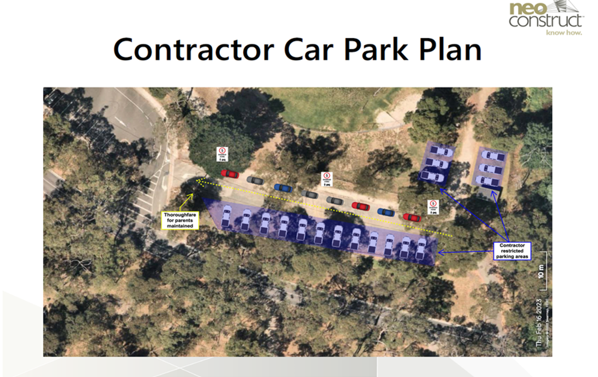 We have come to an agreement with them to trial a ‘sharing’ of the car park space. Neo Construct will have the half of the car park that is closest to Sheffield Road. We will have the half of the car park that is closest to the school.