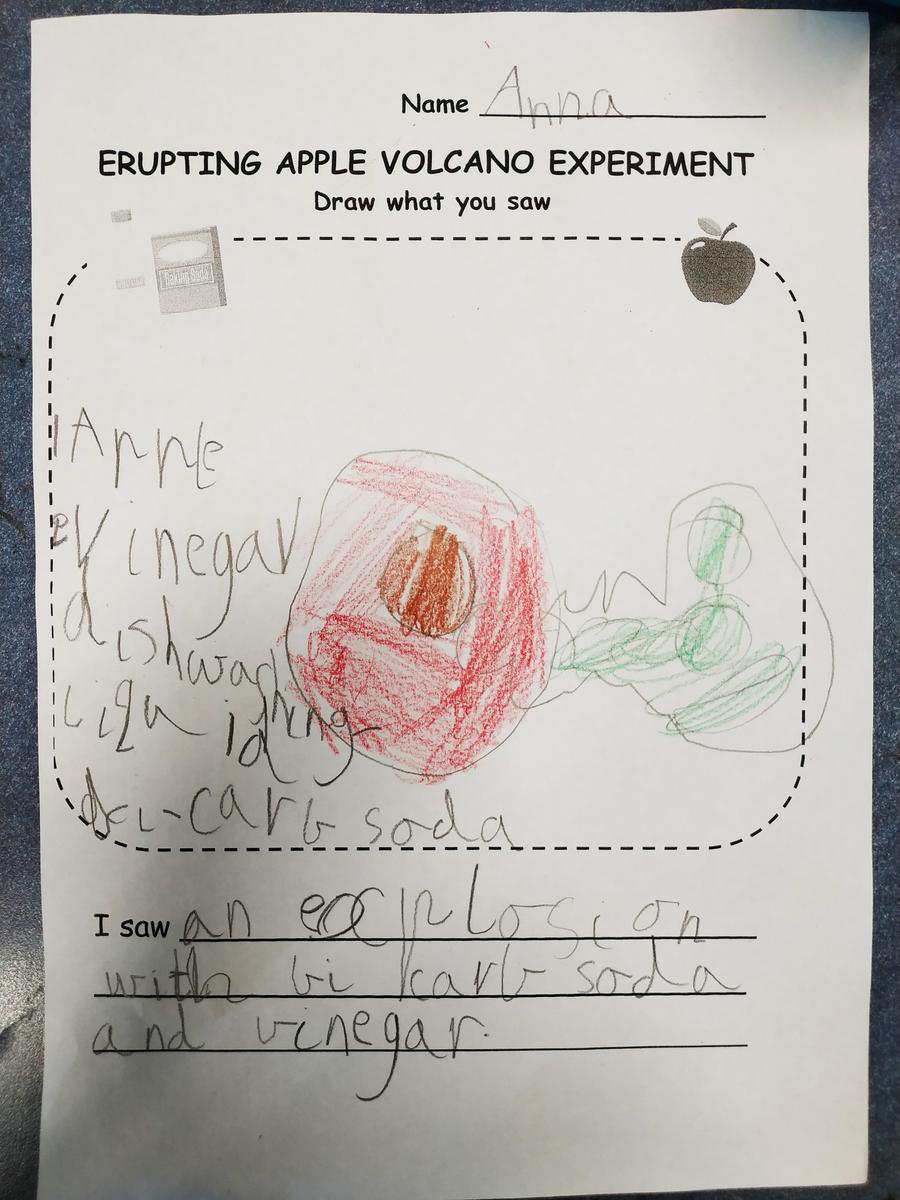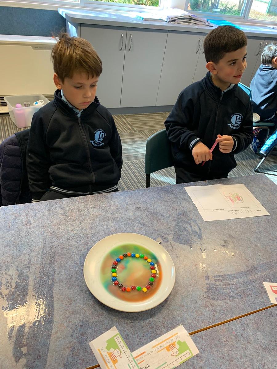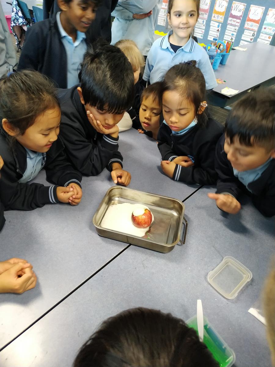 Our preps saw how the colours of lollies spread in a plate of water, and learnt about chemical reactions when their apple volcano exploded! They learnt to make predictions about what they thought would happen.